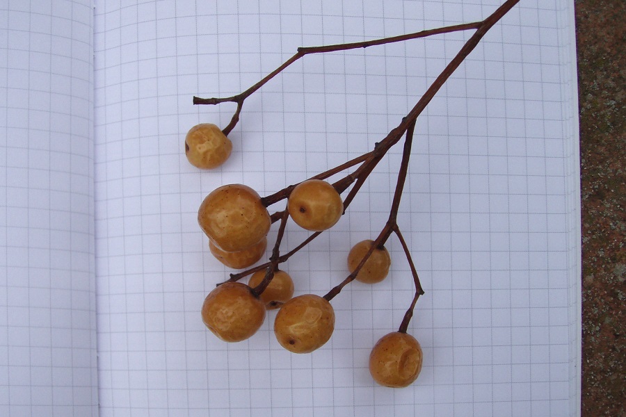 Dal centro della corolla, costituita da cinque stretti petali, si erge una struttura tubolare, di colore viola scuro,……formata da stami saldati fra loro, con in cima una specie di merletto.Le antere giallissime sono rivolte all’interno, e pure racchiuso in questa specie di torre si trova il pistillo.Nelle lingue evolute tutto ha un nome: gli stami così saldati fra loro si dicono monadelfiIl pistillo occupa tutto lo spazio disponibile, e lo stigma bombato va a sbattere contro le antere.Infiorescenza a pannocchiaNumerosissimi fiori profumati distribuiti in chiazze;… …a seconda che i fiori siano in bocciolo o dispiegati, il colore delle chiazze cambia con le settimane. Frutti, quasi sferici e polposi; dapprima verdi diventano ambra in autunno Gli ambrati globuli permangono sulla pianta, facendo bella mostra di sé, per tutto l’inverno. All’interno curiosi noccioli costolati utilizzati, prima dell’invenzione della plastica, come grani per corone da rosario; da qui il nome comune dell’albero. La cosa veramente singolare è che sono naturalmente traforati il che sembra fatto apposta per farci passare un filo.
