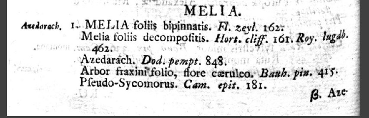 Melia azedarach L. Nome imposto da Linneo nel celeberrimo Species Plantarum del 1735 a pagina 384