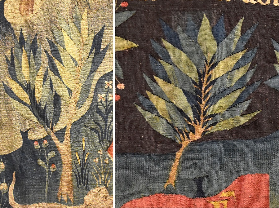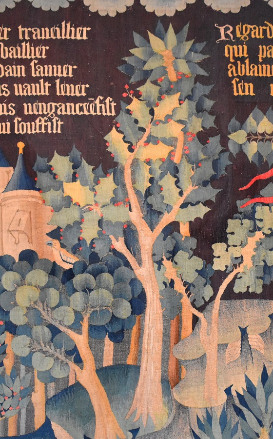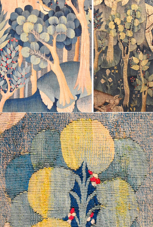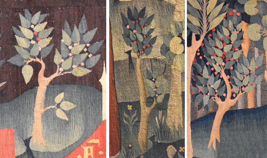 La storia è avvincente e affascinante, come tutte quelle che si declamavano, e si cantavano al suono di flauti, liuti, e tantissimi altri strumenti musicali, nelle corti del medioevo. E l’arazzo oltre ad essere bello da ammirare, è molto importante essendo uno dei pochi pervenuti dal XIV secolo. Potrete trovare più ampia spiegazione a questo link. Qui parleremo dei numerosi alberi raffigurati, sia perché questo, dopotutto, è un blog di alberi, sia per dare un piccolo contributo al superamento della nefanda divisione fra le due culture, quella umanistica (o piuttosto artistico-letteraria) e quella scientifica.