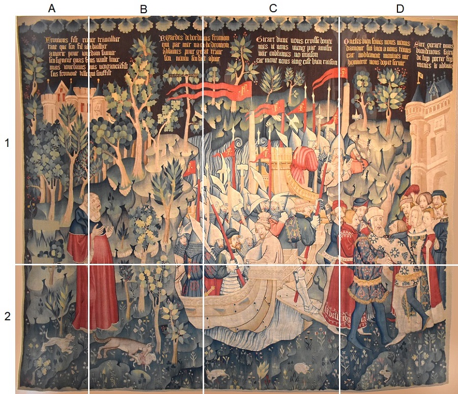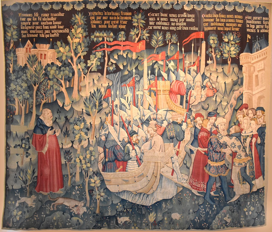 Il museo agli Eremitani di Padova conserva un prezioso arazzo franco fiammingo, 1380-85. Il manufatto faceva parte di un ciclo dedicato a Jourdain de Blaye, e raffigura l’incontro tra Fromont e Gerart, che prelude al tradimento del primo e all’uccisione del secondo. Gerart tuttavia sarà vendicato dal figlio Jourdain, il nostro eroe appunto. È la Chanson de geste.