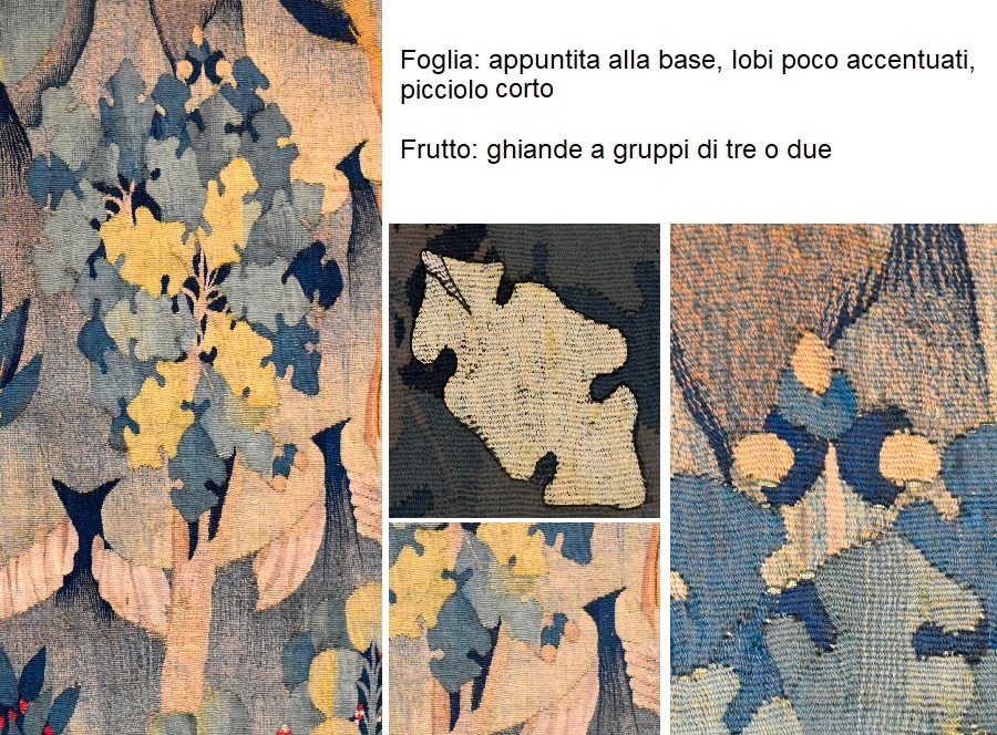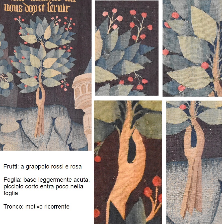 Se c’è un albero che uno non si aspetta di trovare nelle Fiandre, o se volete nella zona dove si svolge la vicenda (la costa atlantica della Francia), è proprio l’Albero di Giuda. Eppure nell’arazzo compare quasi dappertutto. L’areale di questa pianta è il Medio Orientale, forse fino ai Balcani, e alcune fonti danno come epoca di introduzione in Europa centro occidentale addirittura il 1500. Perché ci sia resta dunque un mistero; certo l’autore dei cartoni era uno che la sapeva lunga…
