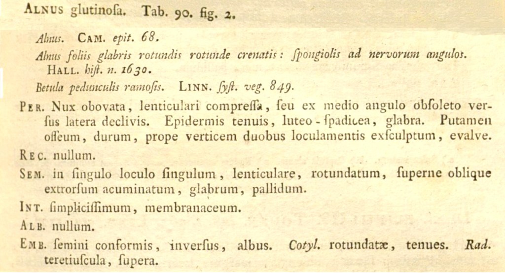 Seguono i nomi precedenti della pianta, fra i quali anche quello assegnato da Linneo che l’aveva chiamate Betula glutinosa.Segue la descrizione del genere (glutinosa) che, come costume di quest’opera, si concentra su frutti e semi.