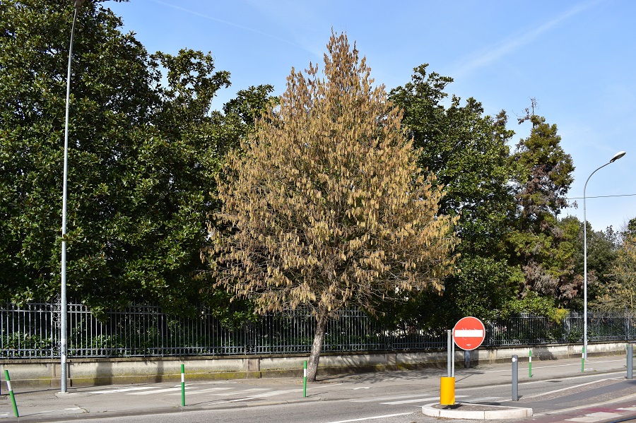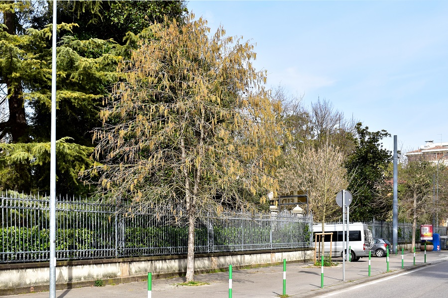 Via Facciolati, la rampa del Ponte di Voltabarozzo, giovani colurna dalla caratteristica forma conica. Incredibile fruttificazione delle piante della foto precedente. Un posto tanto sconsigliabile da frequentare per il traffico feroce quanto, almeno in questo caso, ricco di sorprese. Le nocciole sono più piccole e han forma più allungata dell’avellana; sono racchiuse da brattee molto appariscenti (cupole). L’infruttescenza permane a lungo sulla pianta; a sinistra appena formata, a destra dell’anno precedente (Luglio 2017). I fiori maschili sono simili all’avellana e anche il periodo della fioritura è lo stesso.Molto simili anche quelli femminiliI rossissimi stigmi sono piuttosto restii a emergere completamente dalle perule.Qui alla fine di febbraio con gli stigmi quasi secchi e un vistoso rigonfiamento alla base che lascia immaginare l’ovario ingrossato.Maggio. Le nuove foglie e i rametti sono ricoperti di peli un po’ dappertuttoRametti pelosi e rossi da giovani, poi diventano marrone e glabri. Foglie alterne. Presenza di stipole. Lamina larga con nervature secondarie regolari, bordo doppiamente dentato a denti seghettati. Fusto dritto, corteccia grigiastra.Con l’età si frattura in placche irregolari lasciando apparire i tessuti sottostanti rosso mattone. Può capitare che si stacchino sottili strisce. Gemma apicale (estremo del rametto).In città non ci sono molti alberi di questa specie, qui un grazioso filare in Via Cavallotti. Uno degli esemplari in maggio. Sembra in conflitto con un Acero negundo: la timidezza delle chiome?FebbraioGiovane esemplare in Via Manzoni, presso il Pattinodromo ComunaleSullo sfondo una delle aule della Scuola all’Aperto, fondata a Padova nel 1905 da Alessandro Randi.