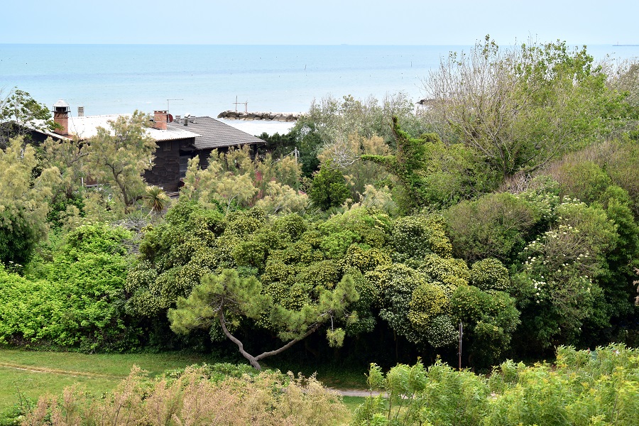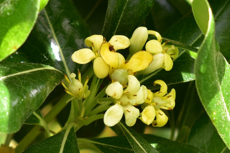 Lido di Venezia, Murazzi. Un florido Pitosforo, fiorito, dalle notevoli dimensioni, domina questa macchia in cui compaiono sambuchi, ligustri, tamerici, pioppi e, in primo piano, un Pino marittimo (Pinus pinaster). Un altro ragguardevole esemplare ai Giardini Treves. MaggioDa diversa angolazione in marzo. La pianta fiorisce in aprile-maggio.Un bell’esemplare, gemellato con un Osmanto, all’Ospedale Busonera.Anche in Orto abitano esemplari degni di nota. Un vecchio Pitosforo addossato al muro di cinta dell’Orto antico sul lato nordovest. E il suo impressionante tronco. La corteccia del Pitosforo è scura, sottile e si fessura molto tardi. Alternanza di superficie nere e marrone; ruvida al tatto ma raramente fratturata. Le foglie sono verde scuro, lucide, coriacee, col bordo piegato verso il basso. Sembrano irradiarsi tutte da uno stesso punto del rametto, ma in realtà sono alterne. Sì, è proprio così. Un po’ disordinate forse ma decisamente alterne.La pagina inferiore è molto più chiara ma ugualmente glabra, e solcata da vistose venature. La forma della foglia è inconsueta ma non rarissima: sottile alla base si allarga verso l’estremità opposta. Il vertice è spesso inciso: una rientranza in corrispondenza della venatura principale.Fiori bianchi con cinque petali, saldati alla base, e cinque stami alternati. Il pistillo è pelosetto e sormontato da uno stigma rilucente. Incontro ravvicinato, anche lo stigma conserva la simmetria pentagonaleTolti i petali (corolla) si distinguono bene sepali (calice) e pistilloLevando un sepalo si vede bene lo stame dal filamento piatto. Le antere sembrano punte di frecce.Sezione longitudinale del pistilloSezione trasversale. Placentazione parietale (gli ovuli sono attaccati alla parete dell’ovario).La Natura commette spesso errori (è questa, in fondo, l’essenza della Selezione naturale): questo fiore ha quattro petali e altrettanti stami. Si notino anche i pistilli grandemente ingrossati alla base: tutti già fecondati. I fiori tendono ad ingiallire profumando vieppiù di zagara. I frutti sono capsule che si aprono in due o tre parti. I lunghi peduncoli sono riuniti all’origine. Parte del pistillo rimane visibile come succede ogni volta che l’ovario è supero. (Foto: settembre) All’apertura delle capsule compaiono rossissimi semi. (Foto: novembre) Una sostanza gelatinosa tiene incollati i semi fra loro. Da qui il nome del genere: parola composta (pitto-sporum) colle voci ‘pitta’ e ‘sporos’, pece e seme rispettivamente.I semi appiccitaticci sono poi trasportati inconsapevolmente dagli animali.Uno spicchio di capsula (valva). Nella foto si distingue bene il modo in cui i semi (gli ex ovuli) sono attaccati alla parete in terna della capsula (dell’ex ovario). Il filamento che assicura il contatto prende il nome di funicolo. Questa specie ci dà un’occasione ghiotta per osservarlo. I due smontati.
