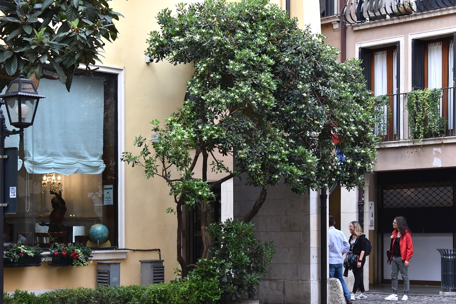Via Soncin in Ghetto La città cambia continuamente, il tobira deve essere morto ed è stato sostituito con un giovanissimo Ulivo. Via Dietro DuomoVia Gaspara StampaIl cortiletto della Scala del Bovolo a Venezia.‘Sopporta bene le potature’: locuzione elegante per dire che la pianta non muore subito. Ma la barbara pratica le accorcia notevolmente la vita. Esiste una cultivar a foglia verde tenue e dal bordo chiazzato di bianco (Pittosporum tobira Variegatum).Un bellissimo esemplare vive all’Orto.