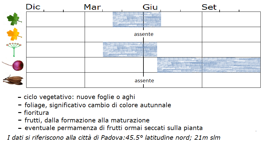 La pagina 27. Nella parte superiore la descrizione del genere, che si concentra sui fiori e i frutti, sotto la specie la cui descrizione si accentra sulle foglie. Interessante il fatto che Aiton usi, ancora nel 1811, la sistematica linneana collocandolo come Pentandra monogyna. Stranamente non compare il riferimento a Thunberg. Ma rimediamo subito. La pagina 99 di Flora Japonica del 1784 (Lipsia). La descrizione e dettagliatissima, ne ho riportato solo una parte. Come si vede dall’intestazione del paragrafo Thunberg aveva attribuito la pianta al genere Euonymus.Fenologia minima: ciclo vegetativo, fioritura, fruttificazioneAreale di origine (native range)