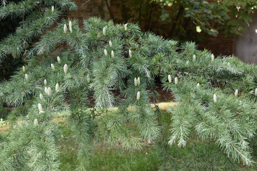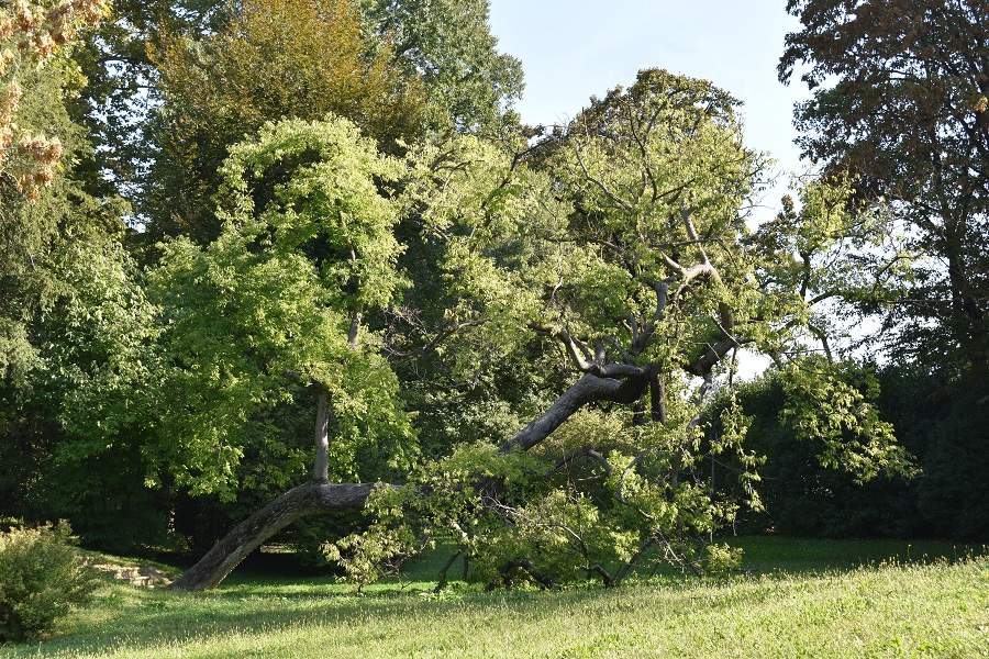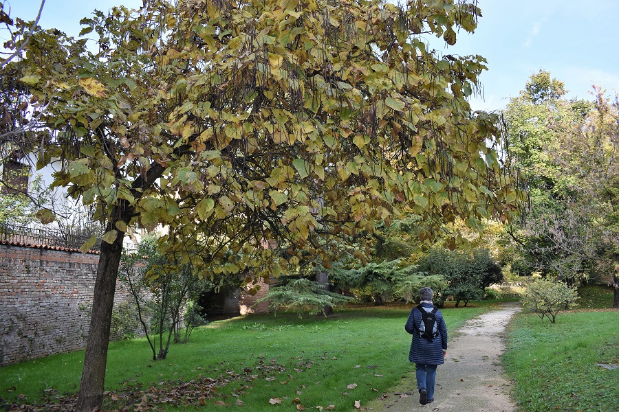 L’ingresso dei giardini, ad accoglierci un Bagolaro dai rametti sottili e sfrangiati.Imboccato un vialetto nella direzione del fiume, e superato un Calicanto d’inverno addossato al muro di cinta, si incontra un gruppetto di catalpe; qui coi colori autunnali. I sottili baccelli restano a lungo sulla pianta.Luglio, frutti di fresco dati fuori.Sempre sul lato sinistro del sentiero, un Cedro deodara dai rami punteggiati di coni maschili. Ottobre.Sul lato destro del vialetto una femmina di Acero negundo. La foto e di gennaio, l’albero ha perso da un pezzo tutte le foglie, ma non i frutti che lo tingono di macchie marrone. Al centro un notevole Acero montano (Acer pseudoplatanus), a sinistra il negundo e più indietro il deodara. L’alberello in basso è un Cornus florida First Lady, un arbusto che in autunno si tinge di rosso. Sulla sinistra, confinante con la vecchia casa del giardiniere, si apre uno slargo abitato da piante preziose: in primo piano due vetusti carpini bianchi dai tronchi fortemente canulati, un Tiglio nostrale (Tilia platyphyllos) a destra, e un Platano orientale che copre parzialmente la vista di una porta.I seni profondamente incisi di Platanus orientalis, una vera rarità dopo che l’Europa è rimasta invasa dall’ibrido, Platanus x acerifolia, che il Nostro aveva subito generato dall’unione col Platano americano.Spostandosi verso il Canale si incontra un magnifico Tiglio nostrale, situato a metà fra terra e acqua. Più in là un Olmo e addossata al muro una Broussonezzia di certo spontanea. Il platyphyllos in aprile, poco prima di fiorire. La foto è presa dal ponte più occidentale. A sinistra una piccola altura alla quale si accede con pochi scalini… …lo spazio è ornato da numerose piante fra cui un imponente Alloro, un Faggio fastigiato e una Magnolia.Sembra fatto apposta per piccole rappresentazioni. In questa foto componenti dell’Associazione Vox Artis presentano una iniziativa dal forte carattere culturale tenutasi nel Giardino il 20 Settembre 2020. Non è possibile qui renderne conto, le dedicheremo un post ad hoc. Un sentieretto aggira l’altura lasciandosene un’altra sulla sinistra dove spicca una vecchissima Tassa.Taxus baccata al centro, a sinistra si riconoscono il florida e il negundo, dietro si vede la cima di un possente Platano che vive su un’altra collinetta più vicina al fiume.