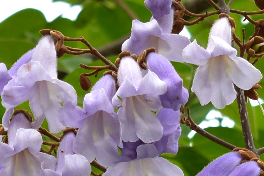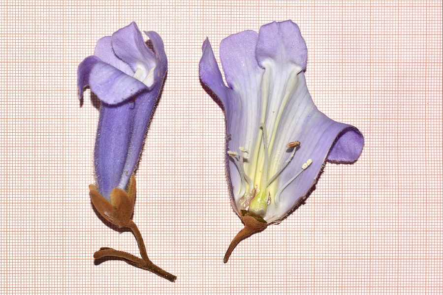 I vistosi fiori viola disposti su grandi candelabri eretti iniziano a sbocciare già in aprile prima che spuntino le foglie, e continuano fino in maggio.Belli da guardare nelle loro incredibili gradazioni di viola.Corolle, calici, foglie e rametti coperti di peluria a volte lieve a volte un vero e proprio tomento (da cui il nome, appunto)All’interno pistillo con un solo stigma, e quattro stami. Caduta la corolla si intravede l’ovario. Anche il calice è bellissimo: marrone avana e vellutato al tatto.Non è facile ottenere una foto con gli organi interni del fiore, troppo lunga e stretta la corolla. Quattro stami ripiegati verso la parete interna e pistillo con avorio pronunciato.