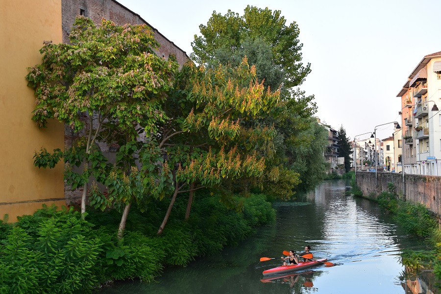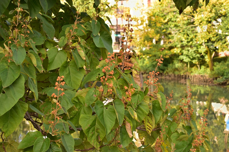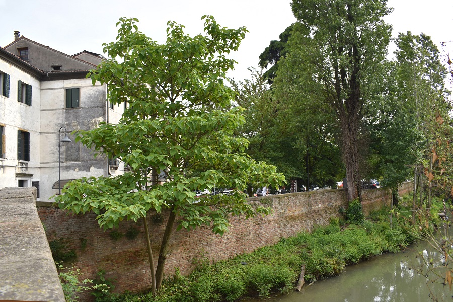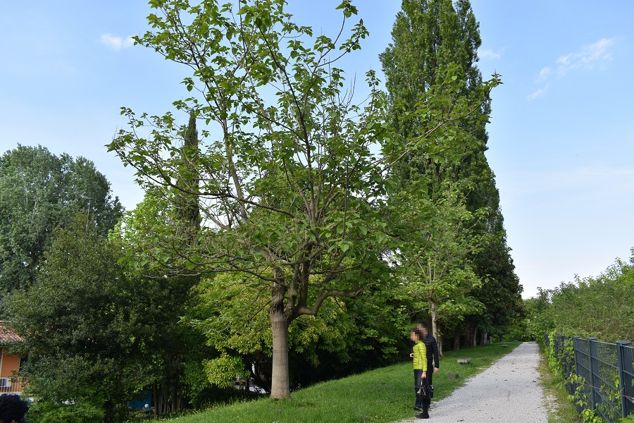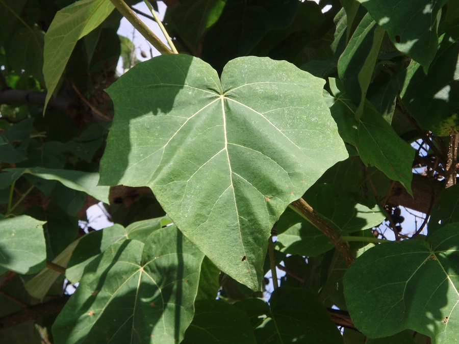 Ottobre 2020, la Paulonia che abita presso il Ponte dell’Osservatorio carica di gemme da fiore. Giovane pianta bellissima che è stata di recente abbattuta. Oggi resta a suo ricordo una cicatrice nel muretto.L’albero in primo piano sulla sinistra è un Ailanto carico di frutti, a fianco una Paulonia con i candelieri curiosamente allineati per quattro e colmi di boccioli. Canale Santa Chiara lungo Riviera Tiso da Camposampiero. Febbraio 2021, per questa Paulonia in Via del Carmine le cose non sono andate troppo bene. Lei in giugno. Le foglie in estate sono di un indimenticabile verde profondo. Sullo sfondo campanile e cupola del Carmine. La forma delle foglie richiama spesso un pentagono irregolare a simmetria bilaterale; attenzione però, poiché presentano uno spiccato polimorfismo fogliare: le ‘punte’ del pentagono possono non esserci tutte o addirittura mancare completamente.Osservando attentamente si nota che non c’è una sola nervatura principale: dall’attaccatura del picciolo se ne diramano cinque. Così quei manuali che classificano la foglia come lobata sembrano aver ragione. Almeno se è corretto partire dalle nervature per stabilire qual è la forma delle foglie.Tanto per trovare un controesempio ecco la foglia di Ziziphus jujuba: ci sono tre nervature che partono dall’attaccatura picciolo ma la foglia non è certo lobata.