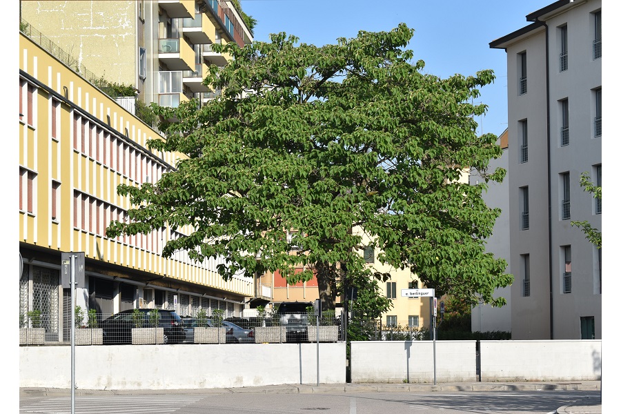 Al centro della foto in alto a sinistra un bel esemplare veglia sul cammino; a lato, disegnato sul tronco, il segnavia del Sentiero 14; in basso a sinistra: pronta a fiorire. Anche se a Unalberoalgiorno non piace parlarne, in realtà c’è un problema con queste piante che scappano dai giardini e si naturalizzano. Se sono rapide nel propagarsi, possono inibire la crescita di altre specie riducendo la biodiversità degli ambienti che colonizzano. Le tre giovani paulonie già incontrate lungo il Calane Santa Chiara, sono forse figliedi quella del ponte dell’Osservatorio (la macchia più chiara in fondo a sinistra).O forse tutte loro sono progenie di un’altra che vive nella stessa Piazza Delia, vicino al ponte di ferro sul Tronco Comune.E se invece fossero tutte discendenti di questa monumentale Paulonia che abita in un giardini privato di Via Boito? Han cercato di contenerla più volte, ma lei non può fare a meno di crescere.