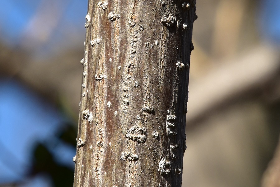 La corteccia è variamente colorata: fondamentalmente grigia, ma con strisce verdi rossastre lì dove si è fessurata, mentre la parte intatta conserva la lucentezza della corteccia giovanile. Il tutto a formare un reticolo damascato.I giovani rami hanno curiose lenticelle in corrispondenza degli strappi conseguenza della crescita.