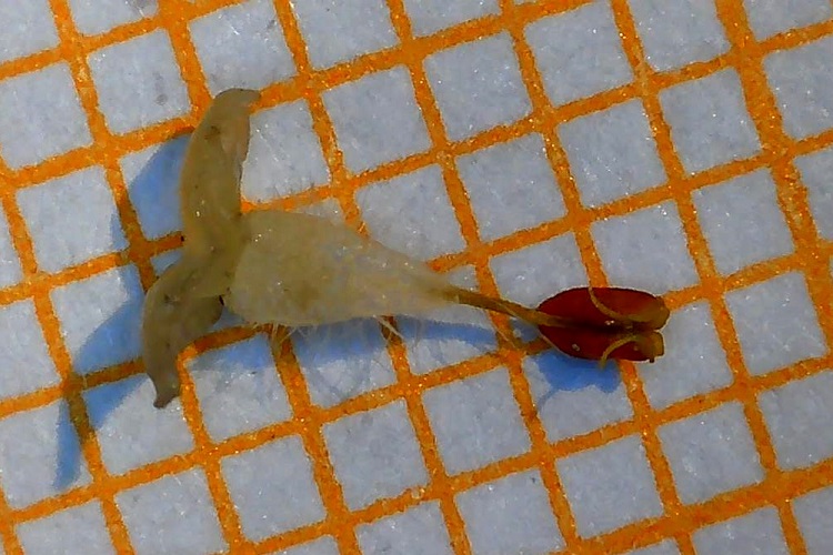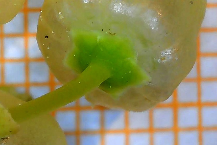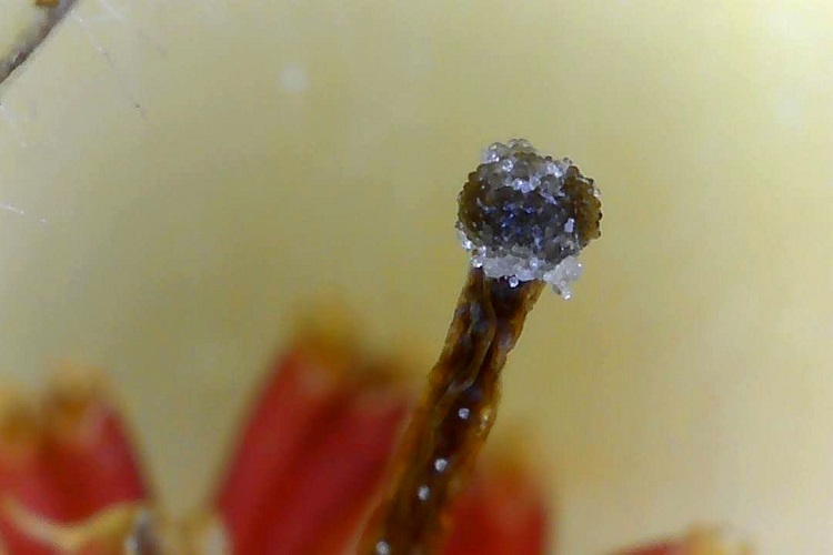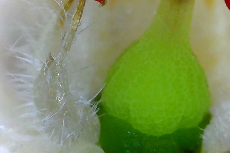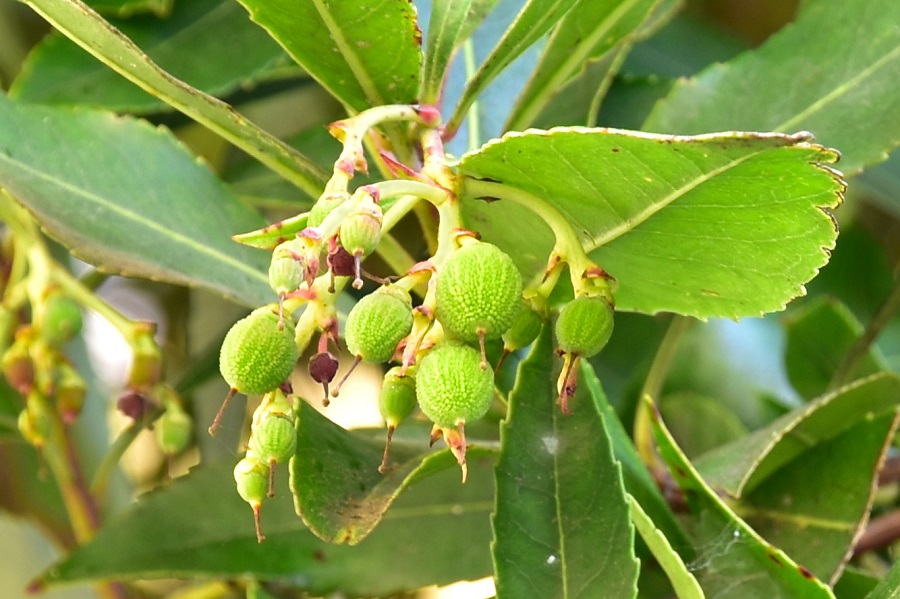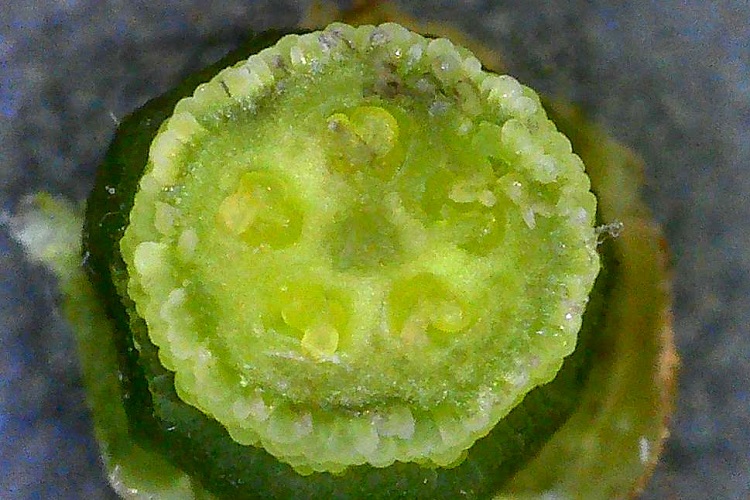 Ottobre. La pianta fiorisce nel tardo autunno e per tutto l’inverno. I fiori piccoli e bianchi, con leggere sfumature rosate o verdoline, hanno i petali uniti a formare una minuscola giara con la bocca ornata da cinque punte ripiegate verso l’esterno. Calice a cinque sepali di cui solo le punte separateImpossibile guardarci dentro. Una irrefrenabile curiosità ci costringe a sezionarlo. Emergono alla vista dieci stami pelosetti alla base e dalle antere purpuree. Il pistillo verdognolo in corrispondenza dell’ovario, si imbrunisce lungo lo stilo; più scuro lo stigma. Stami rivestiti da una struttura pelosa e antere con due curiosi ricci presso le aperture delle sacche pollinicheSingolari aperture nelle sacche pollinicheNell’ingrandimento si vede bene la peluria alla base dello stame.Ovario supero, verde smeraldo e dalla superficie a bollicine assiepate che anticipano le piccole protuberanze della pelle del frutto. Più scuro in basso il nettario.Sezione trasversale dell’ovario, si distinguono gli ovuli all’internoStigma unico, marrone, grondante polline.