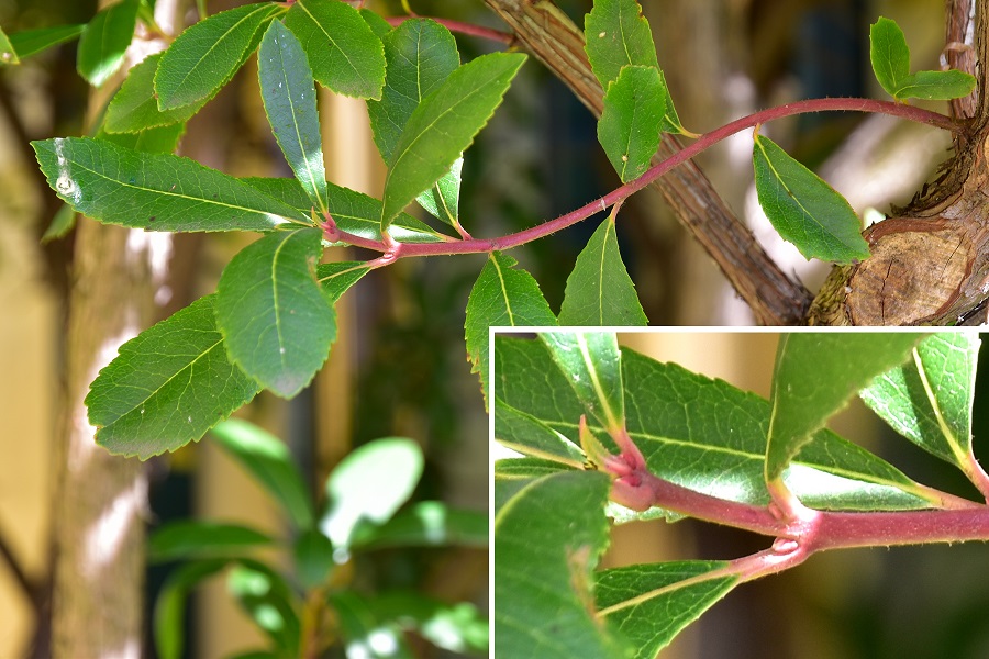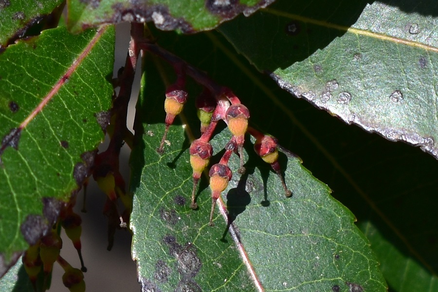 ...altri a la bara intenti, avean di quercia, d’àrbuto e di tali altri agresti rami fatto un ferètro di virgulti intesto e di frondi coperto, ove altamente del giovinetto il delicato busto composto si giacea… (Eneide, XI, 99-104)I frutti sono commestibili ma non molto saporiti, lo denuncia il nome che viene dal latino unum edo ‘ne mangio uno solo’.Loro più propriamente sono bacche: piene di semi.Minuscoli semi spersi in una polpa commestibileIl seme ha forma e superficie tormentata.Le foglie sono moderatamente allungate, dal bordo seghettato e con venature chiare e evidenti. Il picciolo è breve e rossastro.Verde brillante sopra, più pallide nella pagina inferiore. Fillotassi alterna, ma verso la cima del rametto le foglie tendono ad appaiarsi.La corteccia è grigio rossastra e si sfilaccia in strette strisce che si sollevano