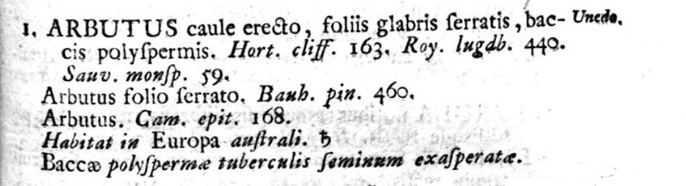 Arbutus unedo L. Nome imposto da Linneo nel celeberrimo Species Plantarum, Stoccolma, 1753