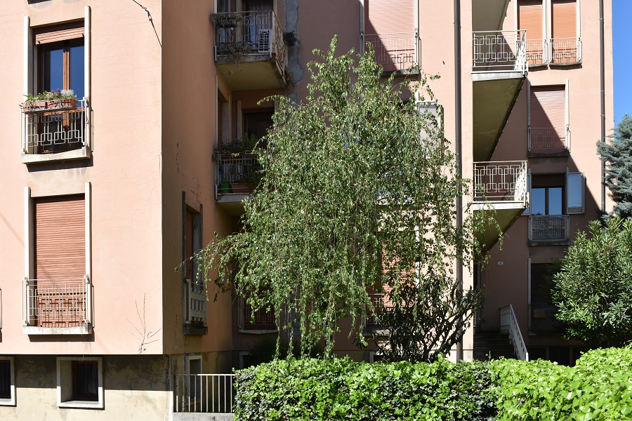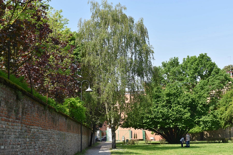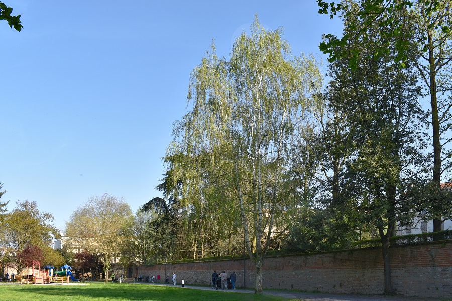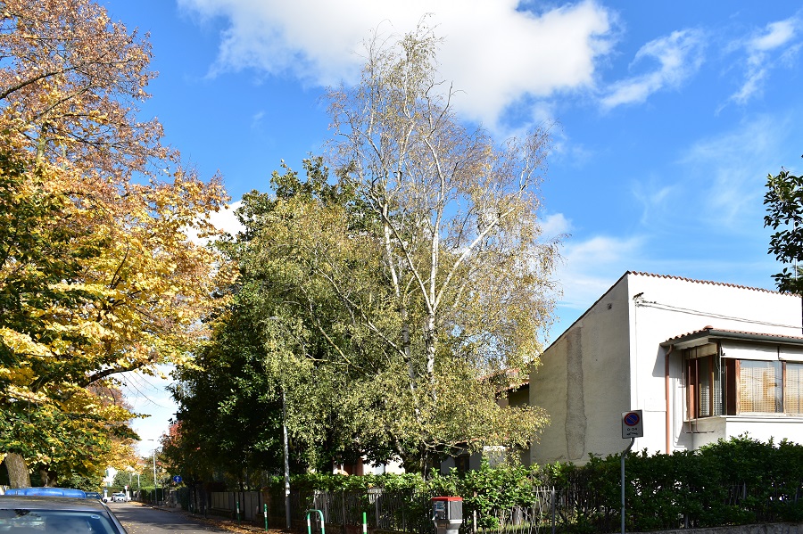 Betulla bianca in Via Cerato, un bell’esemplare facile da osservare da vicino. Giardino Città dei Bambini In invernoDa altra angolazione, il vialetto che corre lungo il muro perimetrale sud.Foglia a losanga con i due lati prossimi al picciolo molto più corti. Vertice allungato, e bordo irregolarmente dentato (a ben guardare doppiamente dentato) sui lati lunghi, intero sui corti. Venature rade e diritte. La pagina superiore è verde scuro, più chiara l’inferiore, entrambe glabre. Picciolo sottile e piuttosto lungo. Nella foto si distingue bene la doppia dentatura e le venature che finiscono nei denti.In autunno le foglie si tingono dal giallo brillante all’ocra intenso.