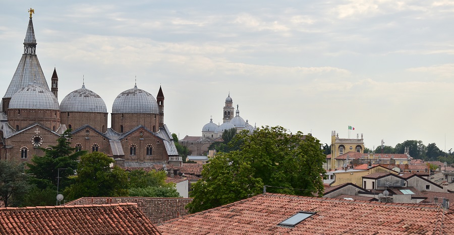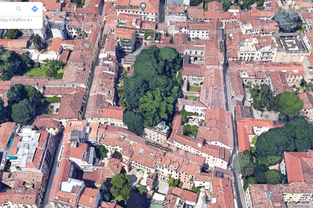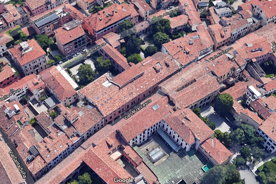E un covo di fuorilegge era il Collegio Universitario Antonianum, gestito dai gesuiti. Oggi trasformato in residenza di ‘lusso’ (parola che piace molto ai nostri amministratori). Un tempo era uno dei più significativi centri culturali della città, con un teatro e un cineforum, ma tant’è.Da sempre, a mia memoria, ha abitato questa piccola aiuola, che adorna l’entrata da Via Donatello, un raro, per Padova, Clerodendro. La scorsa estate un temporale ne ha staccato un pezzo, ma lui ha continuato a vivere. Di recente ho scoperto che non c’è più, non posso dire se è stato abbattuto perché ammalato o perché ormai troppo sgraziato per meritare di ornare una residenza di lusso. Gli incredibili frutti di Clerodendrum trichotomumProprio difronte, una lapide ricorda il sacrificio del Comandante partigiano Corrado Lubian, ucciso ad un solo mese dalla Liberazione.Il corpo centrale del fabbricato sulla destra, osservato dalla torre del Jappelli del Giardino Storico Romiati. Si riconoscono il Santo e Santa Giustina. Infine Palazzo Giusti in Via San Francesco, oggi difronte agli uffici dell’ESU. L’edificio fu messo a disposizione di un reparto speciale di polizia… in realtà una accolita di torturatori al soldo dei tedeschi con al comando il Maggiore Mario Carità, da qui ‘Banda Carità’, che solo a nominarla faceva rabbrividire la schiena ai padovani.(Foto GoogleMaps)Verso la fine del ’44 vi furono imprigionati gli esponenti del CLN del Veneto. E in questo posto oscuro furono oggetto di torture e sevizie. Lo spazio era poco e il Maggiore fece costruire apposite celle, che nella forma e dimensione (1,80m per 1,10m per tre prigionieri) ricordavano le cabine di una nave. Egidio Meneghetti, medagli d’argento per la Resistenza, ebbe l’intuizione di comporre una poesia, che divenne presto l’inno dei detenuti, in spregio dei loro aguzzini. Quattro strofe di altrettanti settenari da intonare sul tema del ‘Ponte di Bassano’.Via San Francesco è stretta, poco illuminata e priva di alberi. Così a meno di non rivolgersi al chiostro della vicina Chiesa, non ci sono alberature da mostrare. Sembra che il caso abbia deciso di non ingentilire questa orrenda storia con immagini delle nobili creature.