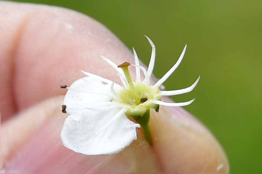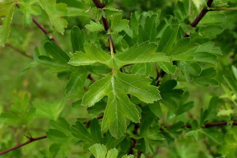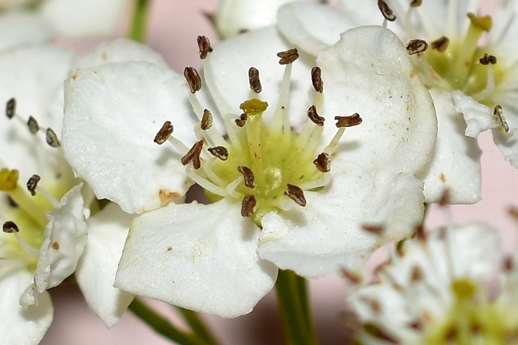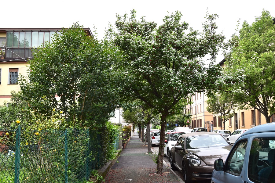 Prunus spinosa in marzo, Campo dei Girasoli. Sullo sfondo un maschio di Salix alba fiorito.Un magnifico esemplare in un giardino privato in Via Urbino. Un posto dove ci sono più esemplari, tutti osservabili agevolmente, naturalmente con la consapevolezza di essere ospiti.Boccioli alla fine di marzo.Fiore a simmetria pentagonale, con antere scure che spiccano sul bianco, o a volte rosa, dei petali.Un solo stilo, carattere che lo distingue dal cugino Crataegus laevigata che ne ha due a volte tre.Le due piante sono per il resto molto simili, così quando si è assaliti dal dubbio non resta che controllare.L’odore è lieve, se il fiore è sulla pianta, ma tende a diventare sgradevole se ne è staccato. I frutti sono rossi e maturano in autunno. Nella foto (fine di aprile) frutti dell’anno precedente. Novembre, nella foto tracce della infruttescenza a corimbo.Impressionante fruttificazione all’Energy Park. Un solo seme. Il residuo del calice denuncia un ovario infero.Spesso si conserva il residuo dello stilo, il che aiuta a distinguerlo dal cugino laevigata anche in pieno inverno.Fiori appena fecondati in maggio.Il nome volgare è parola composta: ‘bianco’ ovviamente dai fiori, e ‘spino’… provate a indovinare. A proposito, le ‘brocche’ del pascoli sono le spine, e lui per dire rami dice spine, credo. Rametto in inverno, brachiblasti pronti a portare foglie e infiorescenze. Prima che i fiori si aprano e le foglie crescano è più facile osservare la struttura dei rami della pianta. Foglia canonica: cinque o sette lobi, seni profondi, nervature verso l’esterno, denti irregolari, picciolo scanalato. Attenzione poiché presentano una certa varietà di forma: controllarne più d’una per una identificazione affidabile.In ogni caso il prototipo è questo, Via Cesare Battisti all’altezza del civico 118. Presenza di stipole, ad ali di demone (almeno come le immaginava Gustavo Dorè). Più spesso le stipole han bordo liscio e dunque molto meno appariscenti.Corteccia grigio rossastra, si squama in placche dal perimetro segmentato irregolarmente.Bella macchia al Parco Milcovich, da sinistra: Prunus mahaleb, Crataegus monogyna, Rosa canina. Tutti arbusti radicati nel territorio. Colli, sentiero del Monte Rosso.Giardino Modì ad Albignasego, alla confluenza di due fossi.Un breve filare di monogyna in Via delle Melette.Poco più oltre in Via Narni. L’albero in secondo piano, o terzo se ci mettiamo anche la siepe, è una cultivar di Acero riccio. Passeggiata Miolato, presso Piazzale Boschetti. Qui abita un piccolo gruppo di monogyna, parte a siepe parte ad alberello. L’albero rossobruno è un Acero palmato, di fronte due giovanissime sofore.
