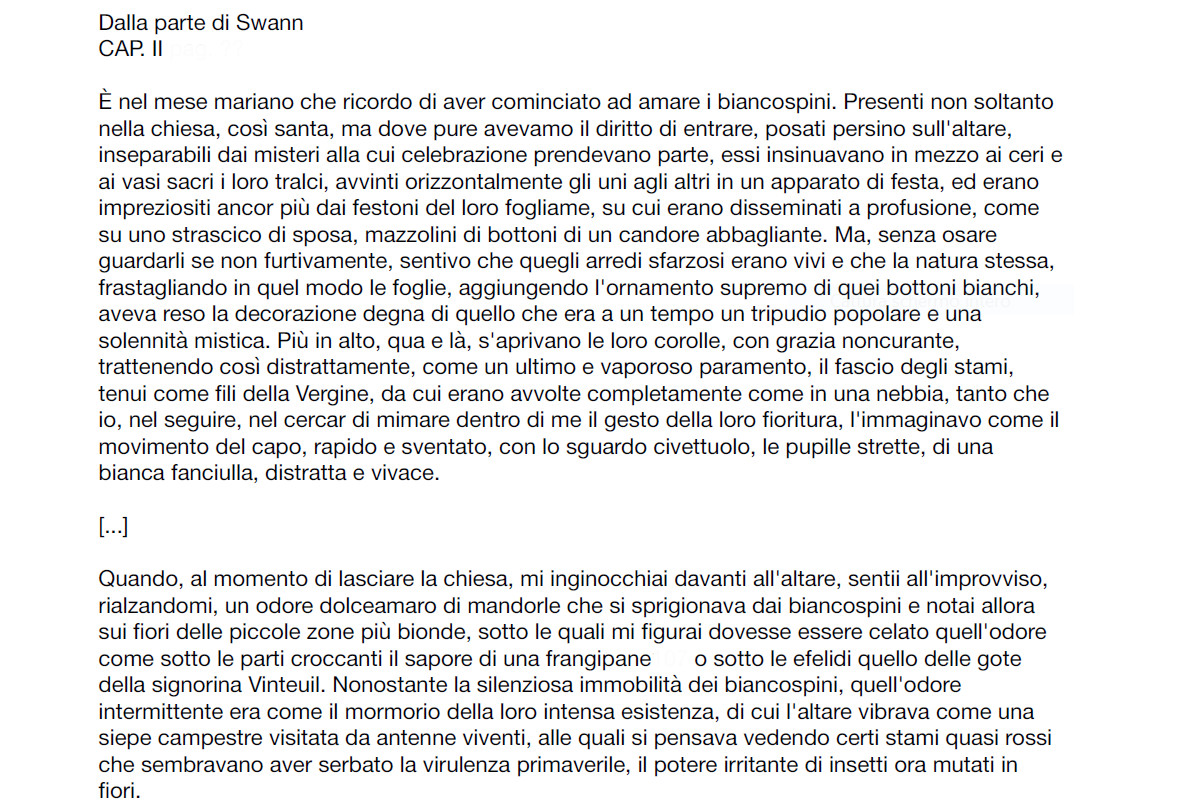 Di marzo per la via della fontana la siepe s’è svegliata tutta bianca, ma non è neve, quella: è biancospino tremulo ai primi soffi del mattino. (Umberto Saba, Il Biancospino, Canzoniere 1921)Ma è nel Proust della Recherche che il biancospino riceve piena soddisfazione. Troppo lunghe le citazioni per riportarle qui, chi vuole può approfittare del file che devo ad una cara amica.