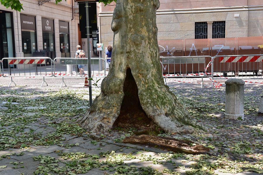 Il buco fotografato un paio di mesi fa. Ma torniamo al racconto.Così appariva il luogo transennato venendo da Via Mantegna.Una allarmante quantità di foglie atterrate.Mi precipito a controllare il buco e noto per terra residui di tronco, oppure corteccia non si capisce bene. Lo sguardo va su, temendo il peggio. E puntuale ecco una carie in alto.Due giorni dopo l’albero è ancora lì. Realizzo che non lo abbatteranno, pare che vogliano solo potarlo. Un gruppo di persone segue l’operato di un collega sulla gru. Non indugio, e mi avvicino a chiedere informazioni. Sono tecnici del Comune che, mi spiegano, stanno attuando una potatura di rimonda (ossia eliminazione del secco). L’albero ha una carie lungo tutto il fusto: il buco in basso è collegato con la carie in alto senza soluzioni di continuità. Tutto questo mi è illustrato da una giovane donna (tutti loro sono almeno laureati) di cui non faccio il nome.L’uomo in alto controlla la pianta ramo per ramo. E quelli di sotto mi spiegano che sta monitorando la resistenza allo sforzo delle branche più grosse. Sono felice e commosso, sembra di assistere a un consulto di medici al capezzale di un malato. Spesso nei post segnalo eventi tristi e talvolta in aperta polemica con le scelte operate; in questa circostanza è diverso. L’augurio è che in futuro si prenda esempio da questo episodio per procedere in modo altrettanto edificante con tutti gli alberi della città, o perlomeno per quelli che abitano i luoghi più significativi. Siamo abituati a legare i luoghi agli edifici o alle opere d’arte, perché non accomunarli agli alberi che li abitano? Infine un pensiero al Santo, presente in effige e in scultura, che ha assistito benevolmente ai lavori. Quel San Nicola da Tolentino protettore degli oppressi. Troppo facile invocarlo per gli alberi troppo spesso vessati, e perciò eviterò di farlo per non cadere nel patetico…