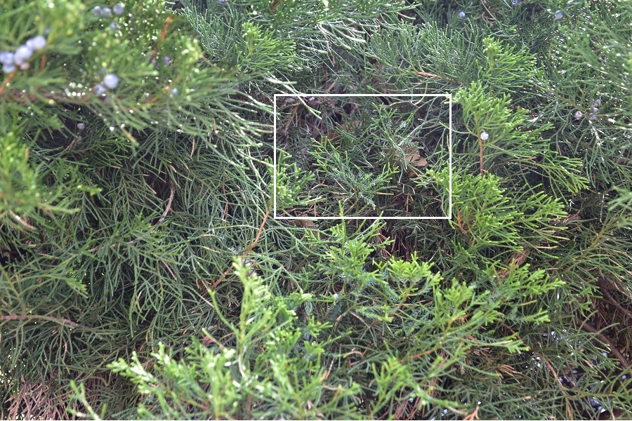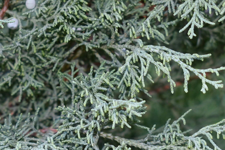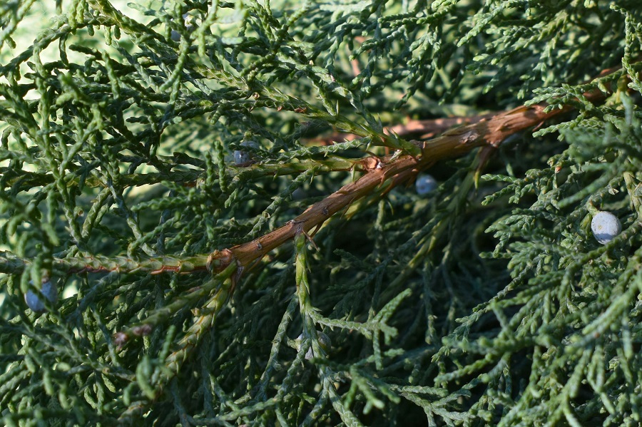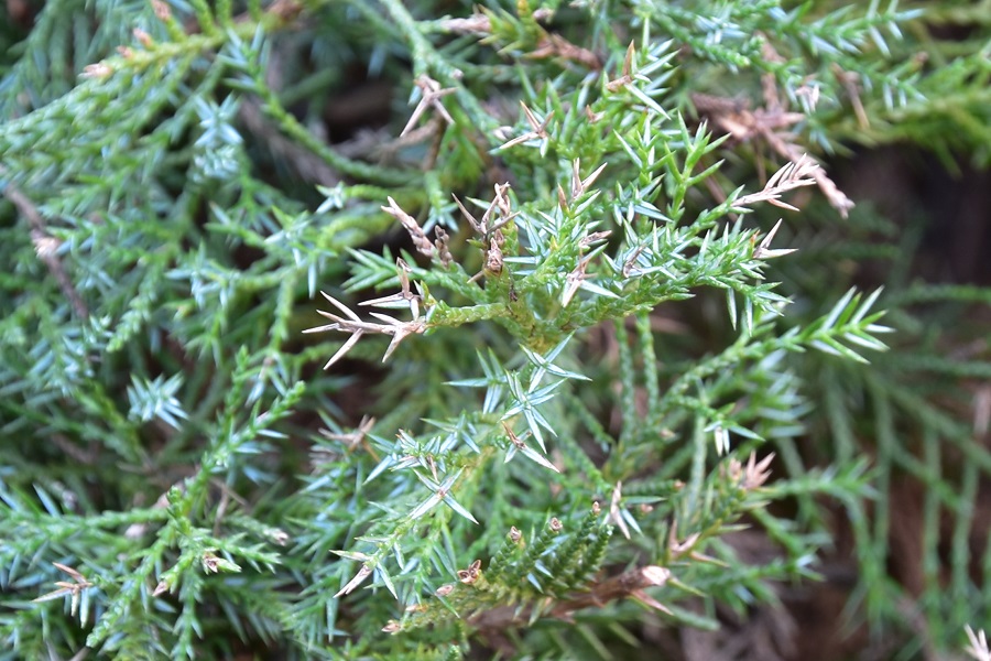 I ginepri hanno per lo più foglie aghiformi, ma sono presenti anche foglie squamiformi. Nel sabina, unico fra i generi, succede che il secondo tipo di foglie è prevalente sul primo, tanto che le foglie ad ago bisogna andarsele a scovare addentrandosi fra i rami.ParticolareNon così in primavera quando compaiono sui giovani rametti. Gli aghi sottili e appuntiti non sono tuttavia pungenti.Rametto.Di norma però lo spettacolo è più o meno questo.Le foglie, entrambi i tipi ovviamente, hanno disposizione opposta, con le coppie sfasate di 90 gradi fra loro (decussate). Perlopiù verdi all’esterno sono glauche sulla pagina inferiore.Nella foto si vedono bene sia la consueta disposizione su quattro file delle squamiformi, sia la fillotassi opposta. Ogni fogliolina porta una ghiandola che se strofinata emana un aroma resinoso.