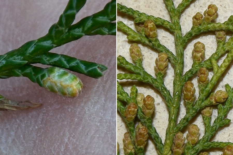 I galbuli sono ricoperti da una pellicola cerosa protettiva. Frutti recenti assieme a quelli dell’anno precedente.Frutti appena formati, in aprile.Protuberanze spiniformi irregolarmente disposte.La pianta fiorisce in febbraio, nella foto coni maschili maturi.Incontro ravvicinato. Fra le squame si intravvede una sacca pollinica.Una squama rovesciata con tre sacche polliniche.Dopo aver leggermente scosso un rametto: nugoli di polline simili a nubi di polvere interstellare.I fiori femminili è sempre difficile trovarli in questo genere di piante; anche se loro se ne stanno in cima ai nuovi rametti. Il polline entra dai buchi. Questo cono ha una forte somiglianza con quello di Thuja orientalis (stessa famiglia: cupressacee). Corteccia rossastra o mattone che si stacca a strisce. Il tronco ha andamento prostrato e si divide presto in rami più o meno sottili. Rametti dello stesso colore della corteccia, verdi quelli dell’anno.