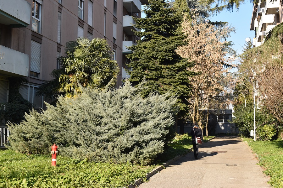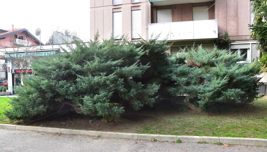 La silhouette inconfondibile del sabino. Questo maschio (la pianta è dioica) abita il Ponte dell’Osservatorio.Passeggiata conciapelli, due giovani maschi lungo il Tronco Maestro.Una femmina in un giardino privato di Via Palestro. Dietro nell’ordine: Trachycarpus fortunei, Abies sp, Acer negundo. L’esemplare è notevole e vale la pena osservarlo da altra angolazione.Uno dei sabini dei Giardini Santa Rita. In mezzo ci han lasciato crescere un Euonymus japonicus. Segno che quest’ultima pianta si è completamente naturalizzata; della serie: ‘la Natura in città’.Alcuni giardinieri amano fare la sfumatura a queste piante, snaturandone completamente il portamento.Un gruppo di sabini in un condominio fra Via Giotto e Via Matteotti.Monumento ai Reduci di Russia. In primo piano Falso indaco.