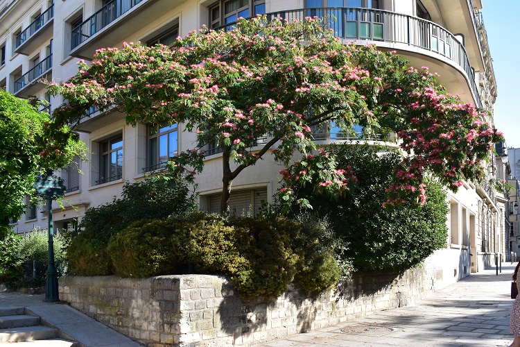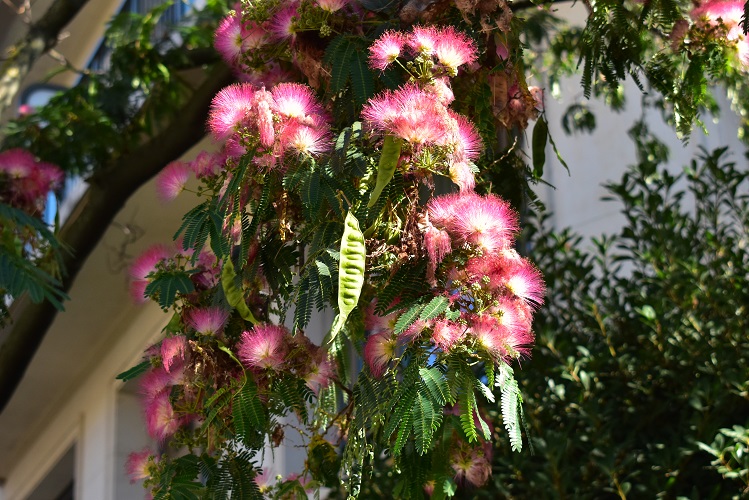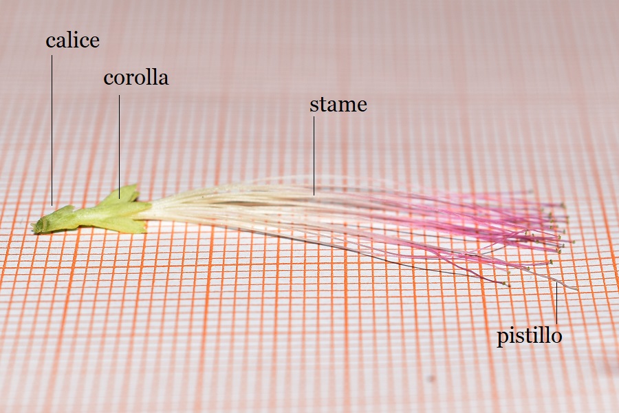 Ogni capolino è attaccato, tramite il suo peduncolo, all’asse dell’infiorescenza come nel più classico dei grappoli. Singolo fioretto: calice con quattro sepali; corolla imbutiforme con altrettanti petali. Gli stami, fra i quali emerge il pistillo, sono raccolti a formare un pennellino. Calice e corolla pelosettiParticolare dello stilo e, in cima, lo stigma. Incredibile la quantità di animaletti che bazzicano per i fiori… Minuscolo stigma. Nella foto si distingue un granulo di polline.Ovario. Gli stami sono saldati alla base.Le nuvolette colorate sono fiori appassiti. Il frutto è un baccello le cui pareti sono modellate dai grandi semi.Corteccia grigia e compatta, si fessura tardi.Poi ci sono i muschi che si mettono in mezzo… Nella foto si vede bene l’attaccatura delle branche quasi a formare un quadripiede rovesciato. Più sotto la cicatrice, perfetta nel taglio, di una vecchia branca. Via Santa Maria in VanzoPuntando lo zenitL’Albizia di Ponte Molino Via delle Melette, lì dove sbocca in Via Monte Cengio. Questa pianta è in una terra di nessuno: non appartiene al piccolo giardino privato né è segnata sulla Mappa del Comune. I peggiori incubi si avverano sempre: uccisa per lavori di ristrutturazione fra il 2021 e 2022.Lungargine dei Barcari, Lungo il Canale di Battaglia, presso il Bassanello. Un esemplare bellissimo e vetusto nel giardino della Canonica dell’Abbazia di Santa Maria delle Carceri. Un giardino curatissimo e ricco di belle piante che merita una visita e presto un post.Parigi, nei pressi dei Giardini del Lussemburgo.