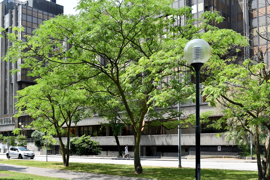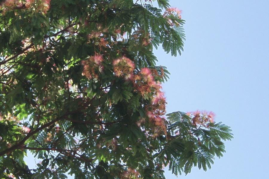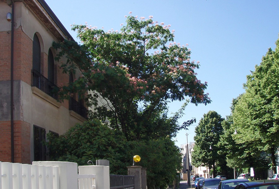 Una delle albizie dell’Orto, i rami assurgono ripidi e poi ripiegano quasi bruscamente conferendo alla pianta la caratteristica chioma ad ombrello. Sulla destra si intravede una delle vecchie serre.Un breve filare in Via Gozzi, purtroppo queste piante si devono essere ammalate. Nella foto si riescono a scorgere le foglie composte (doppiamente pennate) che ricordano quelle della mimosa.Con l’aiuto dell’Omino Stree View ho potuto rintracciare i resti dell’abbattimento. Erano là in fondo, si intravedono fiorite… In secondo piano il Tempio della Pace.Giovane albizia fiorita a Ponte Molino.Foglia ampia, doppiamente pennata con numero pari di suddivisioni, colore verde chiaro sopra e sotto.Piccioletto brevissimo. Quasi inesistente il picciolo delle foglioline secondarie. Curioso andamento della nervatura principale delle secondarie: sembra l’asta di una bandiera. Pagina inferiore.Lei raccoglie le foglie col freddo o in assenza di sole o se accarezzata.