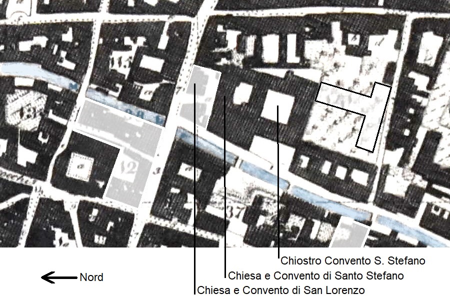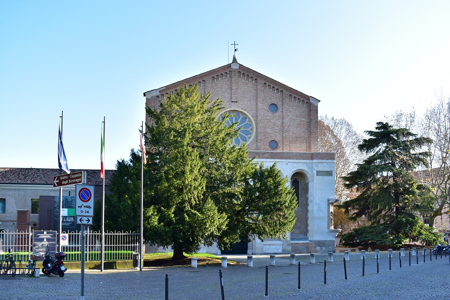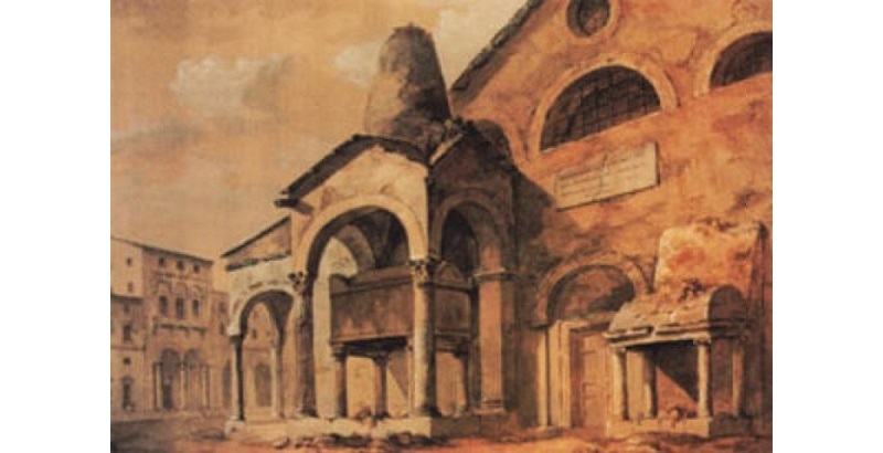 La fermata del tram della Linea 1 ornata da una manciata di alberi di cui due tigli, ancora una volta americani.La strada si stringe in corrispondenza dell’invadente retro del Palazzo del Bo e improvvisamente sbucati in Via San Francesco appare Piazza Antenore. Non sono, per una volta, i palazzi signorili della piazza ad attrarre per primi l’attenzione ma due bellissimi cedri dell’Atlante dal colore verdeblù e dal portamento elegante… …che fanno dimenticare di trovarsi in presenza di un essere veramente ‘grosso’.Palazzo Romanin, rifatto in stile neogotico nell’Ottocento. Una lapide millanta la permanenza di Dante. Non è facile fotografare la piazza ché è piccola e costantemente ingombra di auto.A proposito di millantatori: la Tomba di Antenore. Troppo bello tuttavia il richiamo ad una storia così antica per non cullarsi nel dolce sonno di una innocua bugia. A sinistra la tomba del Lovati colui che la scoprì e per primo la indicò come sepoltura dell’eroe. Nel 1985 campioni dei resti del corpo rinvenuto nella tomba furono spediti a Tucson in Arizona per datarli col carbonio 14. Si appurò che la morte di chi aveva abitato quel corpo era avvenuta fra il III e IV secolo. Una vicenda alla quale ha partecipato una cara conoscenza di questo blog, il Professor Giulini. L’area della piazza nella Pianta del Valle occupata dalla Chiesa di San Lorenzo alla quale era addossata la tomba. In entrambe le foto precedenti è visibile un lacerto del muro della chiesa; chi la demolì ebbe la sensibilità di conservarlo.Clerisseau, Veduta della tomba di Antenore a Padova, 1760, Ermitage San Pietroburgo. Si distinguono la chiesa e la tomba del Lovati.Il lato sud della piazza è chiuso dalla facciata del Palazzo della Provincia, costruito negli anni ’30 del Novecento sulla chiesa dell’ex monastero di Santo Stefano per ospitare la Prefettura fascista. La storia delle due chiese che si dividevano il luogo è complicata, vi rimando a questo link per sbrogliare la matassa. Del convento benedettino di Santo Stefano rimane il chiostro, da sempre cuore palpitante del Liceo Tito Livio.