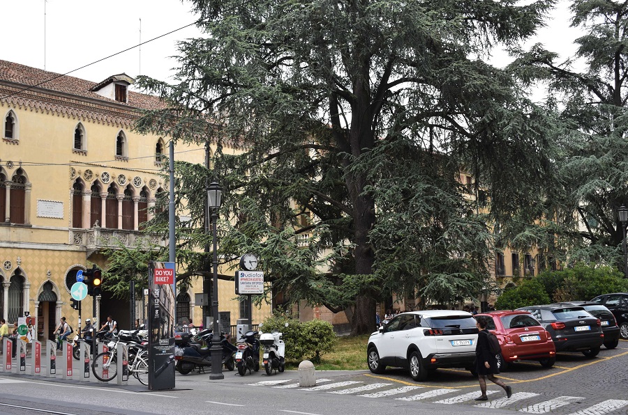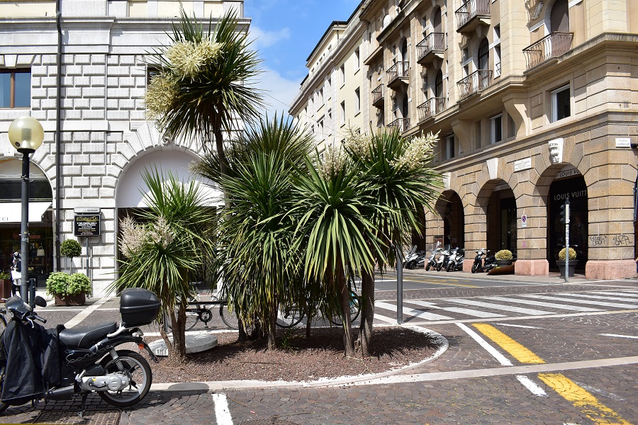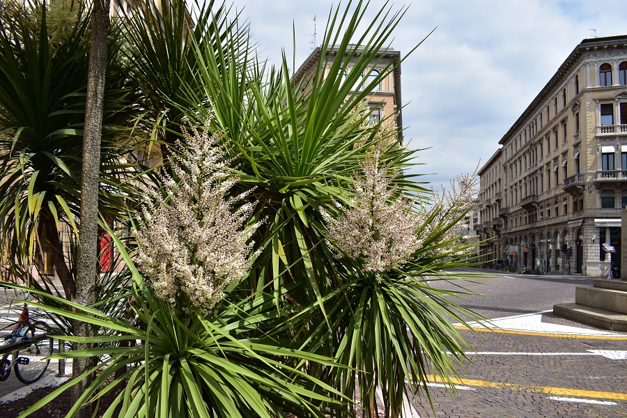 Non prima però di ammirare la facciata posteriore di Palazzo Donghi (1913, poi ampliato da Ponti nel 1961). Un monumento al Risparmio e al Lavoro in stile moderatamente liberty.La facciata sul Corso, di certo più monumentale, ma non necessariamente più bella. A sinistra l’asse viario che porta alla stazione e in basso a destra una vecchia conoscenza: la giovane Chamaerops humilis che di recente ha sostituito, non si è mai capito perché, una florida e bellissima azalea.Eccola, ormai coll’innalzamento delle temperature medie invernali questa specie non ha più bisogno di coperture nella stagione fredda.Cedro deodara dei Giardini dell’Arena. Ci dirigiamo verso Piazza Garibaldi ex Piazza dei Noli.Il posto è abitato da sempre. La Pianta del Valle mostra ancora alla fine del Settecento i tratti di una città medievale. Resterà così fino all’inizio del Novecento quando, dopo la sistemazione del Corso Garibaldi, si passerà a rimodernare Piazza dei Noli e a creare un nuovo asse verso Porta Savonarola (Via Emanuele Filiberto). Prodromi allo sventramento del quartiere Santa Lucia. Gli eleganti e severi Palazzo Menato e Palazzo Società Igea, veri contrafforti di Via Emanuele Filiberto; la loro realizzazione si deve agli architetti Torres e Peressutti rispettivamente. La foto è presa dal palazzo ex Upim e poi ex Rinascente, costruito sul luogo del settecentesco Palazzo Zaborra. Da quando il Liston è divenuto zona pedonale (anni ’80) abitano la Piazza sei Magnolia kobus, piante dalla splendida fioritura, che anticipa le foglie.Due di questi alberi hanno sempre un certo ritardo rispetto agli altri, e ogni anno in marzo, quando fiorisce la specie, danno immancabilmente l’impressione di non essere riusciti a superare l’inverno. Sullo sfondo una recente costruzione: la piazza sembra non trovare mai una sistemazione definitiva. La Piazza porta il nome di Garibaldi da quando la statua dell’eroe fu qui collocata nella seconda metà dell’Ottocento. Dal 1954 è ritornata la Madonna dei Noli, opera attribuita al Bonazza, che nella parentesi garibaldiana dimorava nella vicina chiesa di Sant’Andrea; svetta poggiata in cima ad una colonna collage di pezzi di origine romana. Una lunga storia intrisa di devozione e corporativismo, troppo lunga da raccontare.Da qualche tempo all’imbocco del Liston vive un gruppo di Cordyline australis una pianta dalle dimensioni contenute che in primavera allieta il passeggio, di padovani e non, con una fioritura vistosa. Piccoli e numerosissimi fioretti disposti in un grappolo di grappoli (pannocchia)Simmetria esagonale, piuttosto rara fra gli alberi (ma quella di base tre è obbligatoria per le monocotiledoni di cui la Nostra fa parte), tepali stretti e candidi. Dello stesso colore pistillo e filamenti degli stami. Giallissime antere. Fecondazione, a quanto pare, ad opera degli insetti (entomofila). Da qualche tempo giace fra i tronchi delle cordilinee il quadrante di un orologio solare orizzontale. Un manufatto pregevole a guardarlo attentamente. Manca però dello gnomone a triangolo, pur essendo dotato dei fori per alloggiarlo (le macchioline nere lungo la linea delle 12), ed è anche privo di piedistallo; insomma, dà l’impressione di essere buttato lì, fra le cicche e le cartacce, come una cosa senza valore.