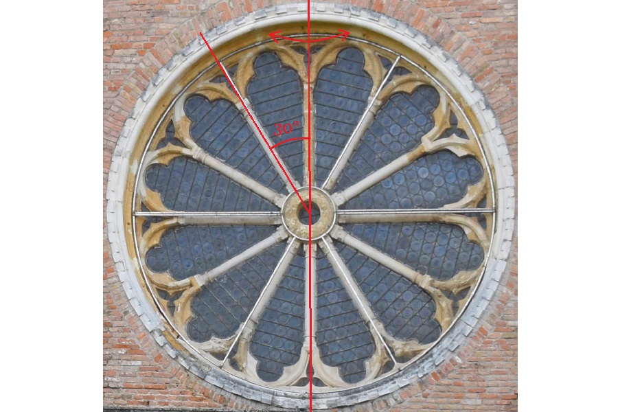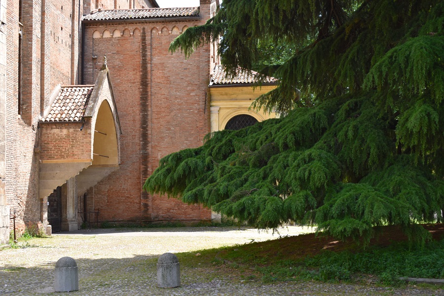La zona circostante Piazza Eremitani nella Pianta del Valle (1782). Il perimetro della Piazza è rimasto identico, ma nei dintorni son cambiate tante cose: Corso Garibaldi – parte centrale dell’asse viario spina dorsale della città, che dal Pedrocchi porta alla Stazione; i due ponti sul Piovego presso Via Porcilia; il Palazzo Donghi-Ponti; il tombinamento del Naviglio Interno e l’interramento del Canale di Santa Sofia, opere quest’ultime mai abbastanza deprecate. Facciata a capanna, ampio rosone centrale, in basso una sorta di loggia ad arcate con al centro il portale principale. Le fanno corona, almeno dalla prospettiva della foto, un Tasso e un Deodara. Numerosi sono i tassi che abitano la piazza, di essi abbiamo parlato diffusamente in un post appositamente dedicato. Quanto al Cedro, una pianta bellissima, è obbligatoria una visita ravvicinata facendosi circondare e coprire dal suo manto. Il rosone posto centralmente, e ornato da quattro occhi, ha una simmetria dodecagonale sia per rotazione attorno al centro sia per riflessione sui dodici assi. Sobri i motivi ornamentali, in accordo con l’austera serenità della facciata.Sovrapposti al rosone gli elementi che generano le simmetrie per rotazione e riflessioneSul lato sud monumentali platani (Platanus x acerifolia) ombreggiano la parete della chiesa gremita di cappelle, alle quali è impossibile perfino accennare. Il portale del Baroncelli (Nicolò del Cavallo) e dietro la Cappella Cortellieri. Proseguendo verso l’abside impossibile non ammirare un vecchio Cipresso scampato al bombardamento del ’44.Un tasso scapigliato in un giardino privato oltre l’abside. Dietro il campanile, e a sinistra l’abside della Cappella degli Ovetari (quella del Mantegna, come tutti sanno). La foto è presa dal portico del palazzo che custodisce l’Ercole dell’Ammannati. Opera tra le più importanti della città, ma celata alla vista dei padovani.