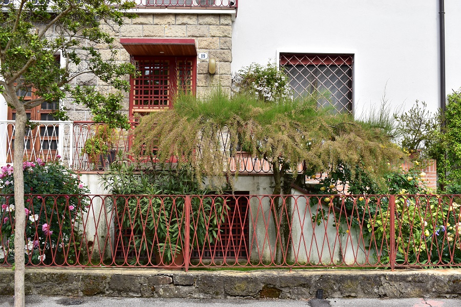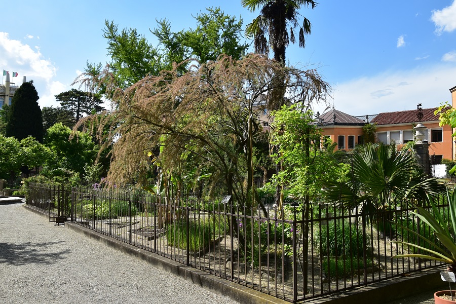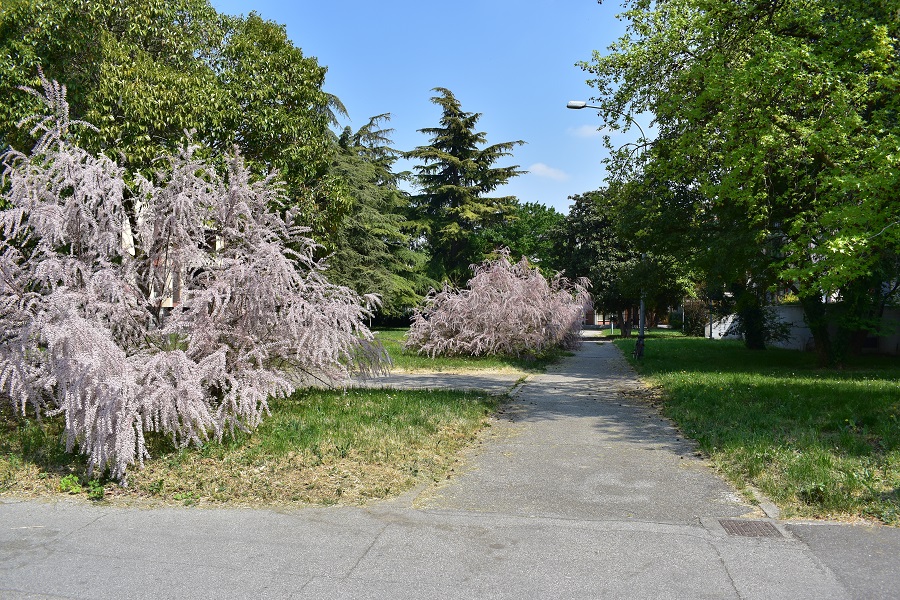 Tamerici spontanee al Lido di Venezia (Murazzi). Come facciano a nascere tra le fessure delle lastre di calcaree o di cosa vivano, con le radici immerse nella sabbia, è un mistero. Più facile ipotizzare da dove arrivino: forse da seme o forse per polloni radicali di piante che vivono oltre la muraglia posta a difesa del lembo di terra dalla furia del mare invernale gonfiato dallo scirocco.Oltre i murazzi si estende un’ampia fascia di vegetazione praticamente spontanea. Nella foto, in Giugno, si distingue in secondo piano una striscia di tamerici con grandi pennacchi: infruttescenze che le fanno assomigliare al cotinus. In primo piano rovi (Rubus ulmifolius) mescolati a Phragmite australis (cannuccia di palude). Sullo sfondo abitazioni. Anche l’uomo ci mette del suo. Una delle spiagge del Lido (Quattro Fontane) ornate da filari di tamerice e più oltre pini domestici. Il verde chiaro di questi ultimi bene asseconda il glauco delle Nostre.A Padova non è molto comune. Naturalmente la si può trovare in Orto, dove uno degli esemplari dà addirittura il nome ad una delle quattro zone (quarti) che si dividono lo spazio del recinto antico. La foto è presa alla fine di maggio: i fiori cedono il posto ai frutti. Sono già spuntate le prime foglie che tra un po’ diventeranno visibili anche da lontano.C’è poi anche un grazioso giardinetto che prende il nome da due splendidi esemplari, dal portamento prostrato, che lì abitano: Giardino delle Tamerici in Via Sografi.Novembre, al centro un Acero palmato e vicino un Ligustro giapponese. I rametti delle due cominciano appena ad ingiallire.Così appaiono i rami in inverno mentre le foglie ingiallite tardano a cadere. I rametti più vecchi han colore rosso mattone, e si protendono con stretti angoli verso il cielo.Rametto terminale in maggio. Le foglie sono appena spuntate. Foglia squamiforme, caso raro tra le angiosperme. Apice acuto quasi uncinato, fillotassi opposta con foglie disposte su quattro file. Le foglie portano ghiandole atte a espellere il sale in eccesso. La tamerice fiorisce fra aprile e maggio con una messe di fioretti dal rosa al bianco, tutti assiepati sui rametti.Aprile. Via Galvani (traversa di Via Peschiera), una piccola strada per un grandissimo scienziato. La pianta fiorisce prima di mettere le foglie. Fiore con cinque petali; dalla corolla emerge il pistillo sfrangiato in cima. Cinque sepali appressati fra loro. I petali si ripiegano in fuori, mentre gli stami portano antere rosa più scuro, si direbbe fucsia. Nella foto si distingue il pistillo a struttura piramidale con base approssimativamente triangolare. I rametti che portano i fiori seccano appena i frutti maturano. Questi sono capsule che evocano la forma del pistillo.Capsula a tre falde. Semi muniti di pappo (un piumino dalla forma caratteristica), per facilitare la dispersione. Non è stato facile scovare i semi col loro piumino, sono essi così minuti che è impossibile osservarli volteggiare o posarsi. La corteccia delle giovani piante è liscia, grigia con sfumature rosso-verdastre, ricca di lenticelle. Negli esemplari vetusti si corruga finemente e diventa grigio-marrone.Giardini dell’Arena, all’entrata meridionale del sottopasso di Viale Perlasca.Un giardino privato in Via Duca degli Abbruzzi. Un individuo dalla strana forma pendente.Via Gozzi (foto Dicembre 2021).Via Carducci, un esemplare dalle notevoli dimensioni. Tamerice gallica non supera i nove metri d’altezza. Ha tronco che si dirama presto (il portamento è spesso arbustivo) e i rami sono mossi e si aprono dando alla chioma un aspetto espanso.Ma tutto è relativo quando si parla di dimensioni… un esemplare al Lido.