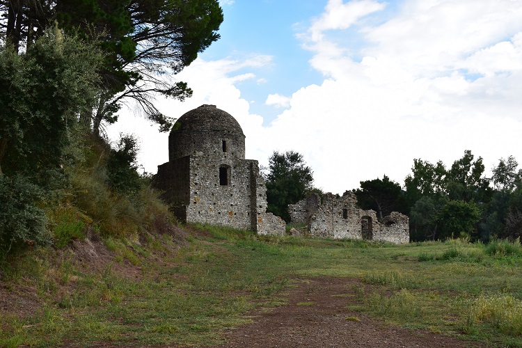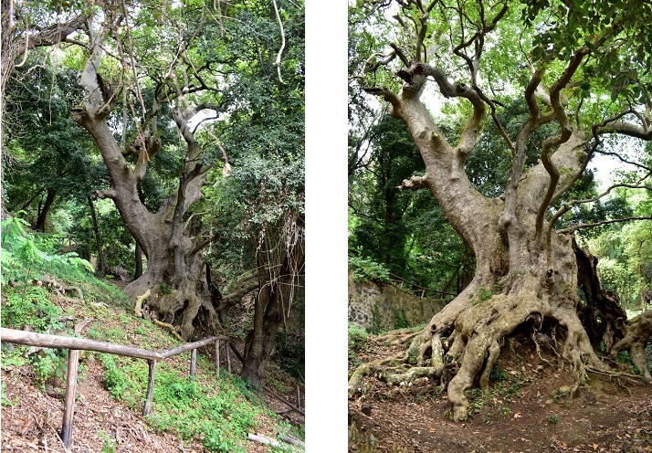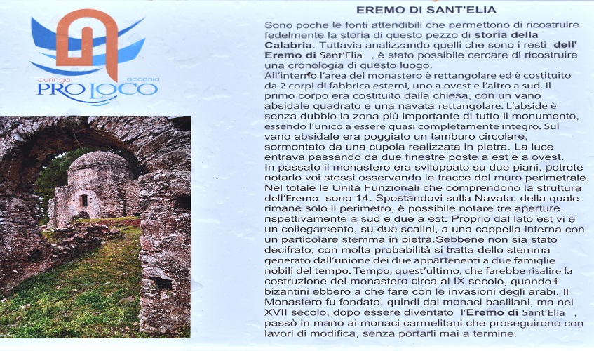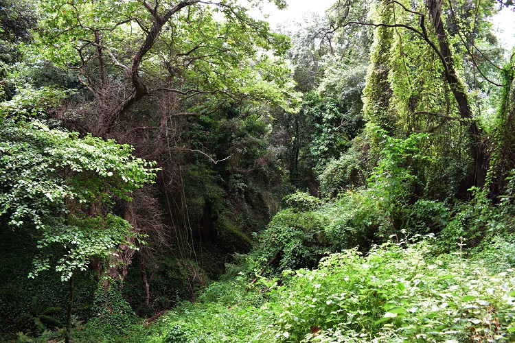 Dopo un paio di tornanti si giunge ad un piccolo parcheggio… …e da qui si scende per un comodo sentiero che, passando dapprima sotto alberi esotici (cipressi dell’Arizona e pini d’Aleppo) e poi fra pini larici (questi sì autoctoni, ma forse fuori posto a causa dell’altezza) conduce all’interno di un vallone.Difficile commentare simili visioni, impossibile, poi, comunicare adeguatamente i sentimenti che suscitano.Si è sopraffatti da un senso di ammirazione per le dimensioni, le immani cavità e, soprattutto, la netta percezione di vetustà che aleggia attorno a tronco, radici affioranti, branche possenti.Ma poi ben presto prevale una sensazione di pace con se stessi e di armonia coll’ambiente circostante.Che si tratti di Platano orientale ciascuno lo può vedere dalle foglie profondamente lobate, nonché arguire dalla sua veneranda età: lui di certo già esisteva prima della scoperta di Colombo. Il vallone dove vive il Platano è attraversato da un corso d’acqua che più giù si getta nel torrente Turrina. Qui la vegetazione è di certo spontanea, vi prevalgono infatti ontani e salici. Vicinissimo al sito si ergono i resti dell’Eremo di Sant’Elia, un convento basiliano (sec. IX) e poi carmelitano (sec. XVII).