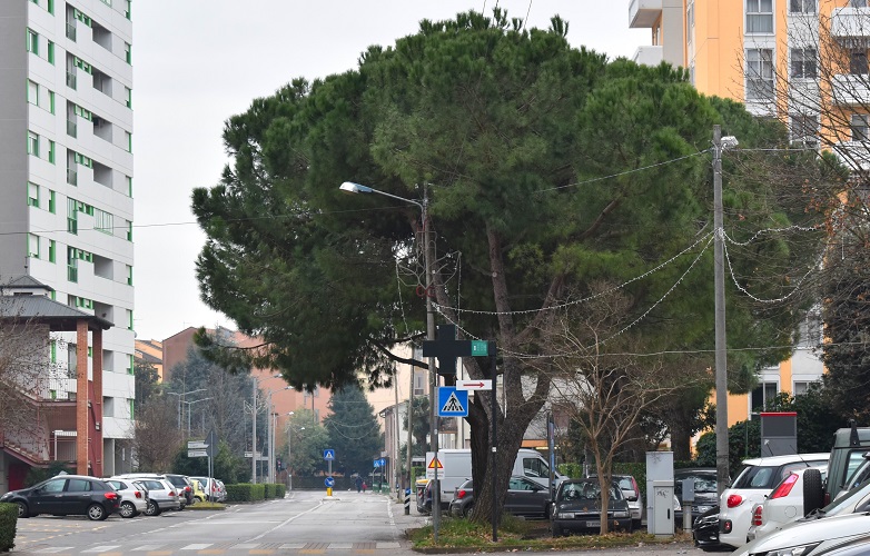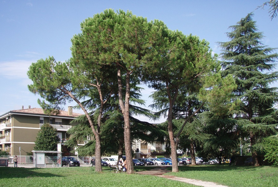 Poco più in là: Via SiracusaE il vicino Giardino FirenzeVia Monte Santo, verso la scuola Diego ValeriUn po’ più a nord, da Via Monte CengioFilare ad alta densità lineare di pini domestici al Cimitero MaggioreUn bell’esemplare isolato.Un nutrito gruppo abita il Parco MilcovichE saltandone non pochi, che potrete divertirvi a scovare da soli, arriviamo al Giardino delle Tamerici dove vivono tre simpatici e affiatati pini domestici. Quindi i due che vivono al Giardino Santa Rita, che somigliano pericolosamente a pini marittimi (Pinus pinaster)E per finire un doveroso omaggio al magnifico esemplare di Pinus pinea che abitava il cortile della Scuola Materna Vittorino da Feltre in Via Galilei. Sarebbe bello se un giorno i luoghi delle città venissero rammentati per i loro alberi oltre che per gli elementi architettonici.