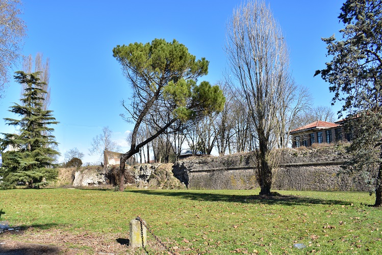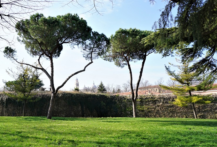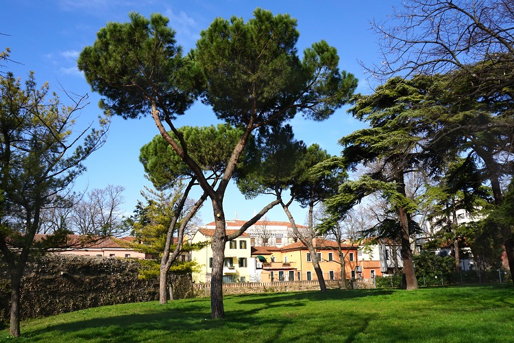 In Piazzale San Giovanni vivono un paio di esemplari non proprio giovanissimi. A sinistra nella foto uno scorcio dell’omonimo baluardo.Da diversa prospettiva.Bastione impossibile, un luogo che conserva tracce di ferite inferte alla città, qui morirono un gran numero di civili sotto un bombardamento alleato, e sempre in questo luogo l’esercito francese in ritirata atterrò il lato sud del Bastione (1801). Una lapide del Comune, posta nel 1988, ricorda il primo degli episodi……e conclude con un accorato ammonimento. L’orrore di quella guerra, scatenata dal rancore e dalla tracotanza nazista e fascista che, in parte col voto di tanti e in parte con la forza, conquistarono alcune democrazie occidentali, ha per fortuna frenato altri conflitti, ma nulla è scontato e tutti sono chiamati a vigilare.Baluardo Moro 1. circondato da un ampio spazio a ridosso delle mura dove vivono numerose conifere.Bastione della Gatta, lo splendido Pino domestico che abita i Giardini alla Rotonda.Da Viale CodalungaDelle Porte Contarine si è già detto……e dei Giardini dell’Arena pure.Trascurandone alquanti, saltiamo al Torrione Pontecorvo. Sullo sfondo si distingue il Campanile di Santa Giustina.Siamo all’altezza di Via Sanmicheli, in fondo il Ruzza.Ponte Saracinesca.