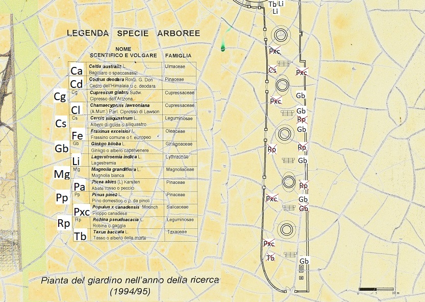Nell’anno scolastico 1994/95 alcune classi del Liceo Artistico Modigliani hanno portato a termine un meritevole lavoro di analisi botanico-architettonica del Giardino, producendo, fra le altre pregevoli cose, anche una pianta del complesso. Quest’ultima è per noi preziosissima poiché fotografa con grande precisione la situazione delle specie arboree presenti all’epoca della ricerca.