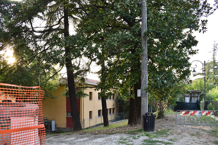 In primo piano una Magnolia e a sinistra i fusti di due cedri dell’Atlante. L’edificio paglierino è la Scuola De Amicis e in fondo sulla destra si intravvedono le Latrine.Fabbricato con una sua identità: snelle lesene sormontate da squadrati barbacani sorreggono un tetto sporgente. Per il resto la composizione è dominata dal rettangolo, almeno tre dei quali sono aurei. Al rettangolo che racchiude la scritta ho sovrapposto (non ho saputo resistere alla tentazione…) una delle tante costruzioni del rettangolo aureo. Serve anche da verifica, il che non guasta…L’entrata da Via Citolo è ornata da uno splendido BagolaroDalla corteccia a pelle d’elefante……e possente chioma. Nella foto l’entrata della Cappella ai Caduti Civili, sormontata da balconcino baroccheggiante, elemento decorativo costante nel Giardino.