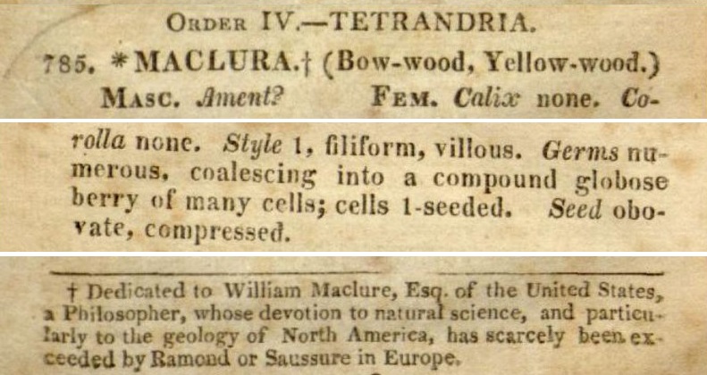 Per racimolare qualche informazione sulla pianta risaliamo a colui che diede il nome al genere. Il botanico e zoologo britannico, vissuto per qualche tempo negli Stati Uniti, Thomas Nuttall. Il libro è: The genera of North America plantes, Philadelphia, 1818, pag. 233. In nota il Nuttal ci dice perché ha voluto dedicare la pianta al filosofo William Maclure.