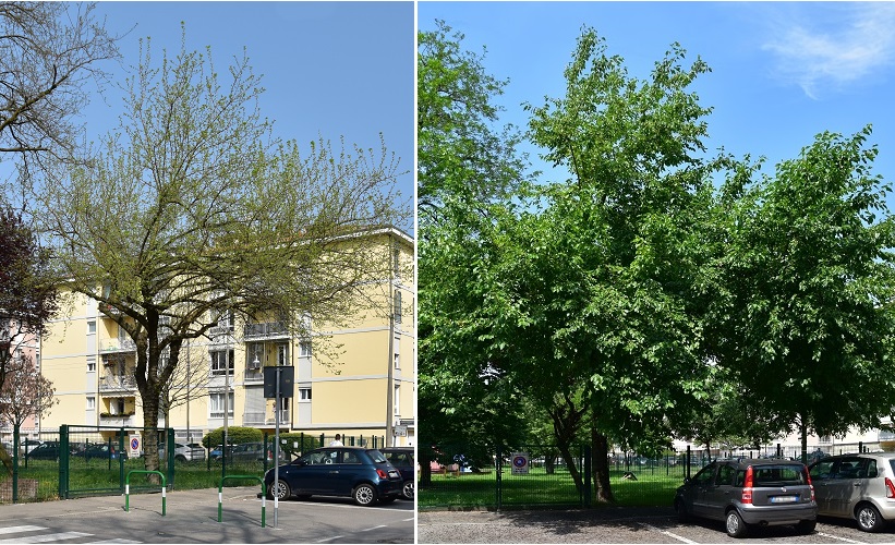 Se volete una panoramica sugli alba, giovanissimi e anziani, il vostro posto è il Giardino dei Gelsi in Via Monte Cengio. Nella foto un giovane esemplare lungo il vialetto centrale.Uno più vecchio presso l’entrata.E il più giovane di tutti, collocato nel posto che era di un caro amico, forse a parziale risarcimento di un dissennato abbattimento.Prima di lasciare questo istruttivo Giardino, confrontiamo il gelso dell’entrata in due momenti differenti: a sinistra nell’Aprile 2021 a destra nel Giugno dello stesso anno. Paiono due piante diverse, vero? Mi sembra un ottimo esempio di come gli alberi reagiscano alle ingiurie che ne deformano il portamento, cercando di nasconderle come meglio possono.