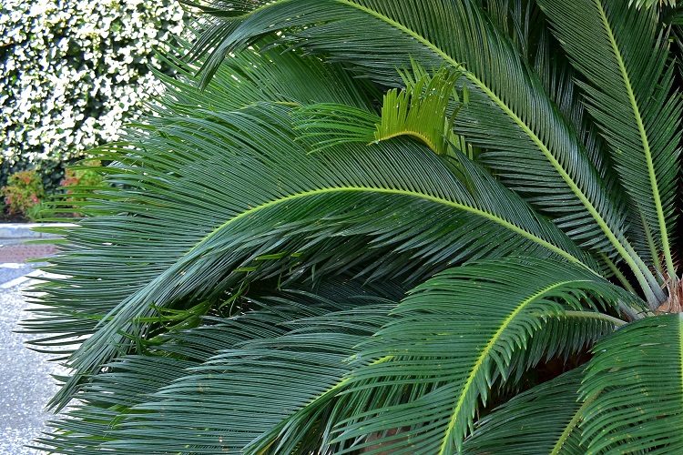 Cycas revoluta, Cycas. Foglia con lungo rachide e innumerevoli foglioline verde profondo, lucide, coriacee a vertice spinato.