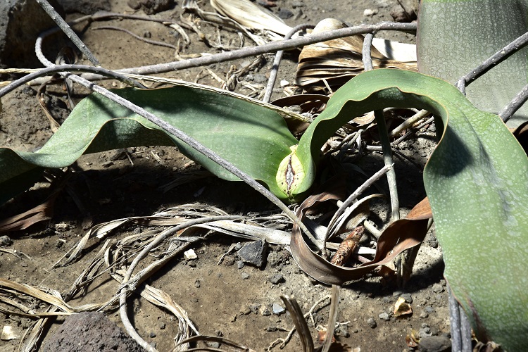 Welwitschia mirabilis, Welwitschia. Foglie nastriformi, innestate sulla cima del tronco, dal colore verde tenue, quasi glauco, coriacee e spesse.