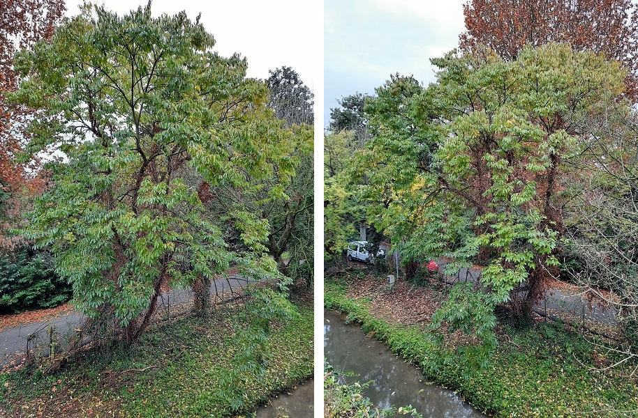 Amalfi, Stendardo devozionale al Santo Patrono. Una comunità dilotus vive lungo il Canale Alicorno, nel tratto in cui quest’ultimo segue le mura prima di attraversare Piazzale Santa Croce. La stradina nella foto viene da Viale Cavalletto e conduce alla sede padovana della libera associazione Marinai d’Italia.La strada vista dai Giardini Alicorno. In basso si riconosce il Canale. Gli esemplari sono molto sviluppati, essi dividono il luogo con un gruppo di giovani magnolie dal fiore bianco. Queste ultime sono regolarmente censite nella Mappa del Comune mentre i lotus non sono mai citati.Albero alto e slanciato a fusto eretto, chioma globosa e compatta. Nella foto un notevole esemplare nel Giardino intitolato a Margherita Hack.Qui abita un gruppetto di lotus. Nella foto un maschio con una curiosa formazione alla base. A fine giugno prendono forma i frutti, piccole bacche sferiche (2-3cm) alle ascelle delle foglie appoggiate come su un vassoio: il calice, formato da quattro carnosi sepali disposti su un unico piano. La fruttificazione è abbondante. Nella foto frutti rovesciati a terra e completamente scardinati da un temporale estivo (primi di giugno).Frutti maturi in novembre, il colore è aranciato, poi scuriscono fino a diventare violacei; sempre coperti da un velo ceroso (pruina).All’interno numerosi piccoli semi marrone.Dicembre, Via Orsini. Un alto lotus carico di frutti sporge oltre il muro della Prandina.Un paio di settimane dopo: semi dispersi sul selciato dopo un temporale e il lavorio incessante delle auto. Fiori con quattro petali carnosi saldati alla base a formare un breve tubicino. Pianta dalla sessualità complicata. Il fiore maschile è privo di pistillo e quello femminile ha rudimentali stami. Il calice è molto più piccolo di quello del kaki.La foglia ha colore e consistenza di quella del cugino, ma è più piccola e soprattutto più stretta. Bordo intero, nervature dritte e parallele, apice e base acuti.Amano disporsi tutte in fila sui rametti un po’ come quelle degli olmi.Fine aprile, gemme da fiore alle ascelle delle foglie.Rametto con gemme.Corteccia grigia tendente al bruno. Si screpola in piccole placche quadrangolari, ma da lontano le fessurazioni verticali prevalgono su quelle orizzontali.Negli esemplari più vecchi (nella foto uno veramente notevole a Villa Guiccioli, Vicenza) le placche si inspessiscono diventando dei corposi parallelepipedi.Il parco della villa ospita alberi notevoli fra cui una monumentale Zelkova.L’esemplare della Prandina in settembre; al centro tra l’edera e i pioppi. Via Paoli, presso il Ponte Saracinesca. Una coppia di notevoli esemplari del giardino della Torre della Catena. Il fogliame è schiarito dai numerosi frutti arancione.L’attacco su Via Pontevigodarzere del sentiero che conduce alla Certosa di Vigodarzere. Il lotus è al centro, facilmente riconoscibile dalla disposizione delle foglie sui rametti.Giovane esemplare dal portamento particolarmente slanciato. Pianta quasi certamente spontanea cresciuta a ridosso delle mura presso il ponte pedonale fra Via Goito e Pio X.In inverno. Visibili le branche principali che gli conferiscono un portamento snello e raccolto.