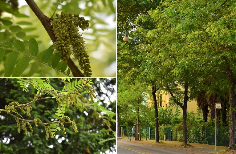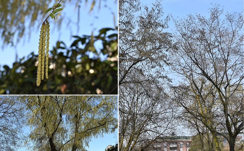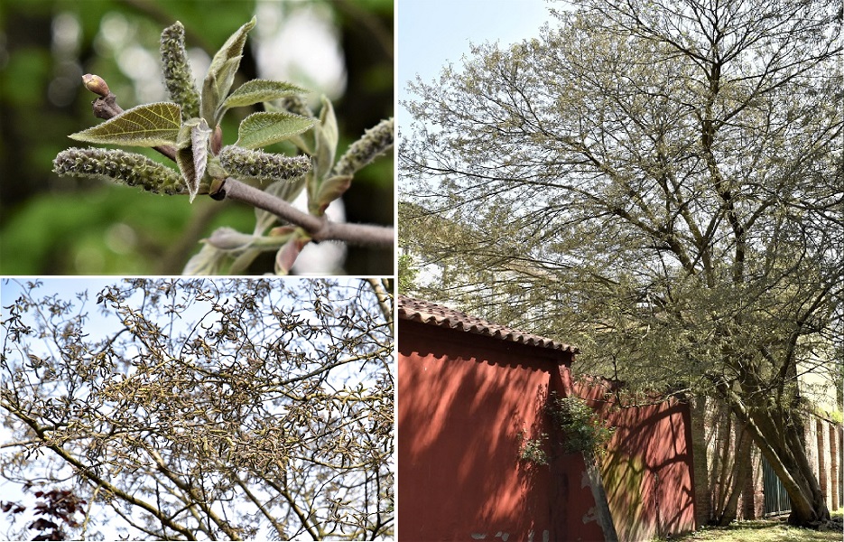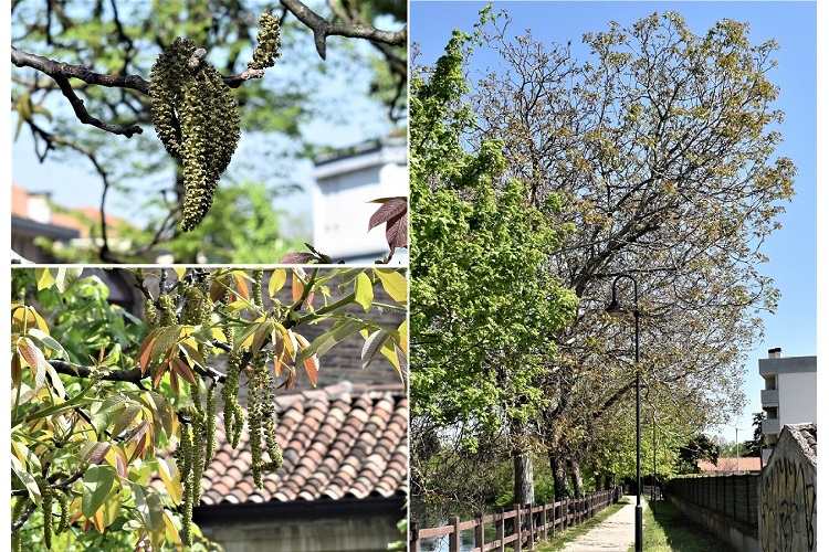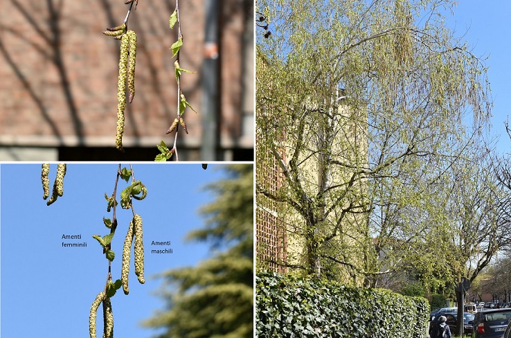 Amenti maschili gialli frammisti alle foglie; il fenomeno è inizialmente discreto, ma poi improvvisamente i marciapiede si riempiono di amenti e polline. (Albero dioico)