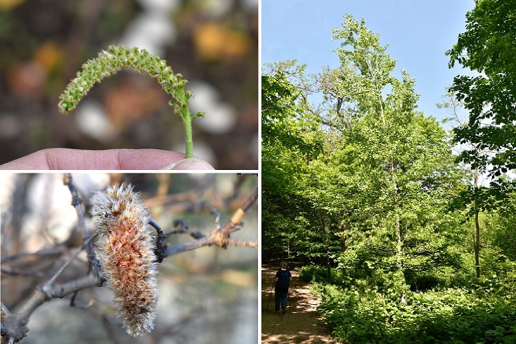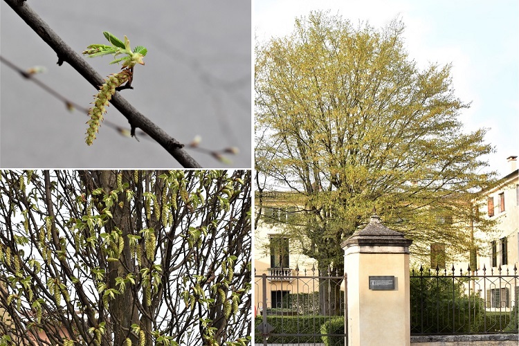 Infiorescenze maschili in lunghi amenti verdognoli punteggiati da brattee nerastre. Il colore degli amenti si mescola, da lontano, col bronzo delle giovani foglie.