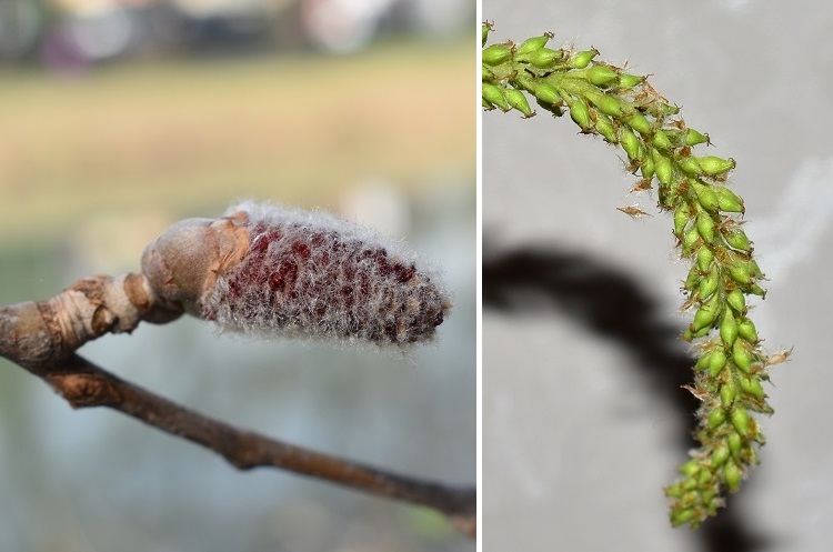 Amenti maschili pelosetti, rossi o gialli, i rami nudi dell’albero hanno un colore rossiccio; gli amenti femminili, dal colore diverso, danno invece ai rami un colore verdino. Albero dioico.
