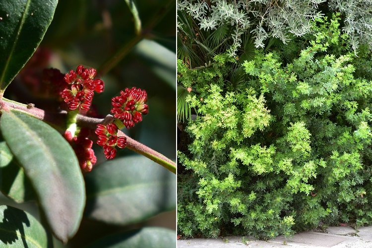 Mazzi di fiori piumosi ricoprono interamente la chioma tingendola di giallo o di rosso, anche il fogliame contribuisce ad un generale senso di leggerezza.