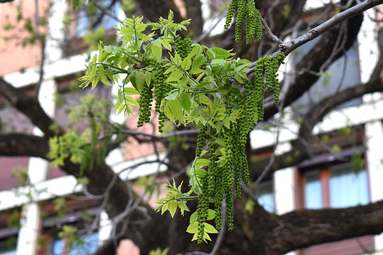 Infiorescenza maschile a grappolo con fiori piccoli e inizialmente verdissimi, poi le antere diventano nere e l’amento si scurisce. Il fiore femminile e piccolissimo e schivo.