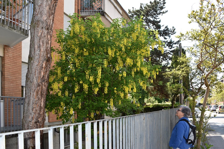 Via Duca degli AbruzziIn città fiorisce ad aprile (a dispetto del nome comune) per non più di un paio di settimane, ma impossibile non notarlo.I fiori papilionacei cominciano a sbocciare dal peduncoloStriature rosse sulla pagina interna del vessilloCalice a guisa di tozzo cilindretto, cinque sepali brevi e appuntiti.La carena racchiude stami e pistillo.In marzo al mettere delle foglie si formano le infiorescenze con verdi boccioli.Fiori appena fecondati: l’ovario si ingrossa e si allunga mentre stigma e stilo si atrofizzano.Giugno, baccelli completamente formati. Resteranno a lungo sulla pianta seccandosi e aprendosi longitudinalmente.Marzo. I semi marrone scuro quasi bruni sono velenosi, come molte parti della pianta.Foglia composta con tre foglioline,……lungo picciolo scanalato; foglioline ellittiche a bordo intero e prive di piccioletto.Pagina inferiore pelosetta, argentata; superiore liscia.Corteccia marrone scuro con lenticelle bianche……verde quella dei giovani rami.Via Tripoli, i rami sono snelli e crescono ad angolo acuto rispetto al tronco. Portamento leggermente espanso.Ancora l’esemplare di Via Duca degli Abbruzzi. Giovane Maggiociondolo dell’arboreto di Agripolis.