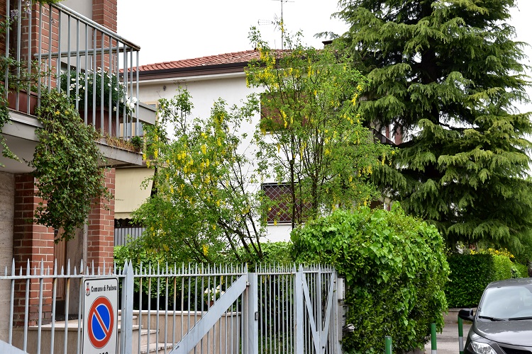 A giudicare dalla Mappa del Comune ne è stato piantato un unico esemplare in una aiuola di Via Trentino (Camin). Molti anni fa un Maggiociondolo abitava un’area verde in Via Martiri Giuliani e Dalmati, ma dopo qualche anno dall’impianto non è sopravvissuto. Stessa sorte è toccata, nel Febbraio 2020, a questo giovane esemplare nel giardino del Busonera. Forse estati troppo secche.