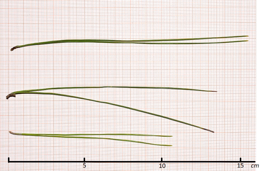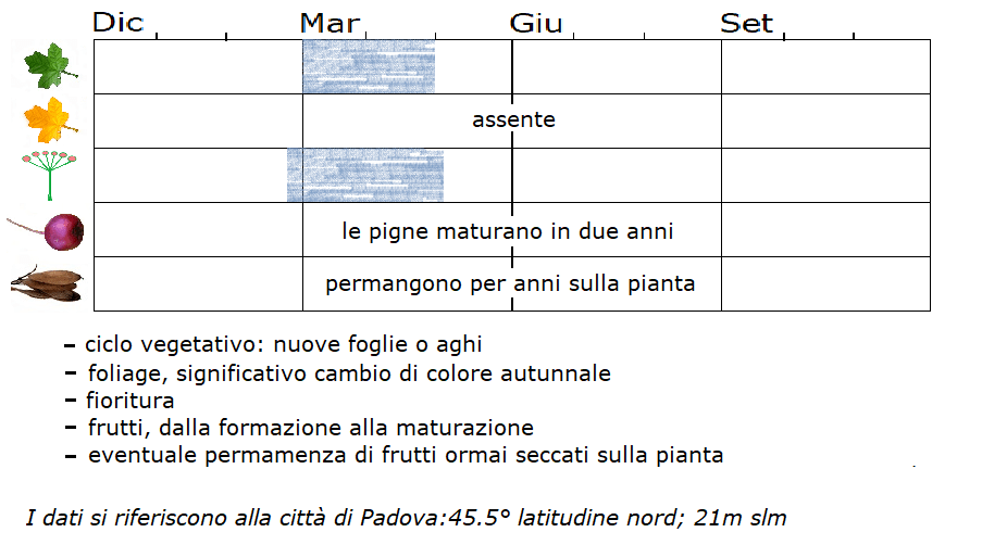 La pagina in questione. La descrizione si concentra sugli aghi sottili, i coni ottusi, rami sparsi. Fenologia minima: risveglio vegetativo, fioritura, fruttificazione.Areale di origine (native range)